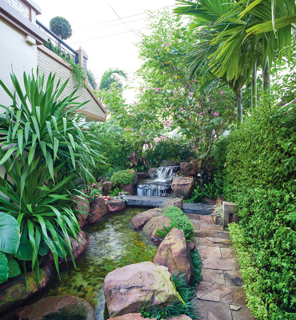 จัดสร้างเลียนแบบธรมชาติอย่างแนบเนียน ทั้งการออกแบบ การเลือกใช้วัสดุ การจัดวางหิน และการปลูกไม้ประดับให้เป็นไปอย่างธรรมชาติ ปิดบังส่วนที่เห็นว่าขาดความเป็นธรรมชาติ เช่น ส่วนของคอนกรีต อิฐ กระเบื้อง ตำแหน่งของระบบท่อน้ำ บ่อกรองเป็นต้น