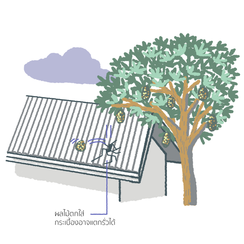 2.กระเบื้องแตกหรือร้าวก็พบได้หากเหนือหลังคามีกิ่งไม้หรือผลไม้ตกใส่บ่อยๆ วิธีการแก้ไขคือให้ช่างปีนขึ้นไปเปลี่ยนใหม่และหมั่นตัดกิ่งต้นไม้บ้างก็ดีนะครับ
