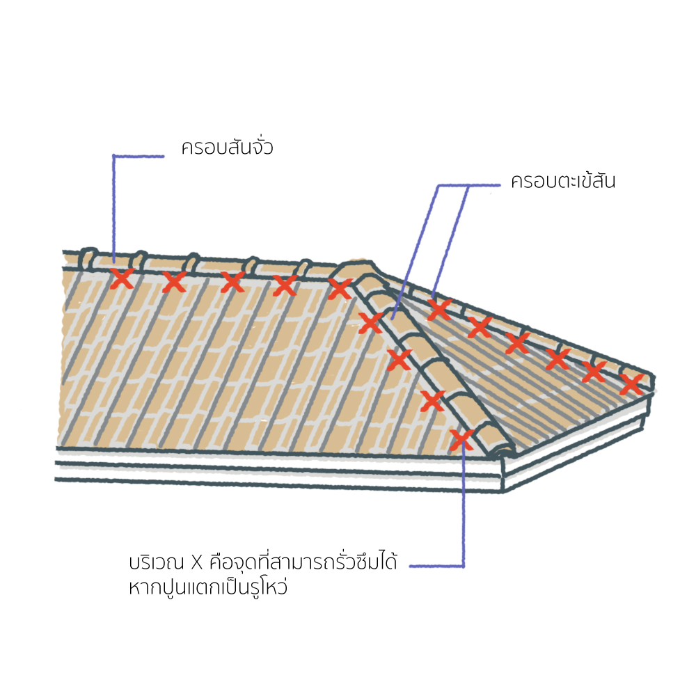 3.ครอบกระเบื้องบริเวณสันจั่วหรือสันตะเข้ที่ใช้วิธีติดตั้งด้วยการแปะปูนเปียกไว้ใต้ครอบ (ช่างเรียกว่าครอบเปียก) นานๆ ไปเจ้าปูนนี่อาจแตกและหลุดออกได้ ทำให้เกิดช่องโหว่เหมือนฟันผุซึ่งเป็นสาเหตุให้น้ำรั่วได้ครับ วิธีซ่อมคือให้ช่างปีนขึ้นไปปั้นปูนอุดซ่อมแซมให้ดีเหมือนเดิม