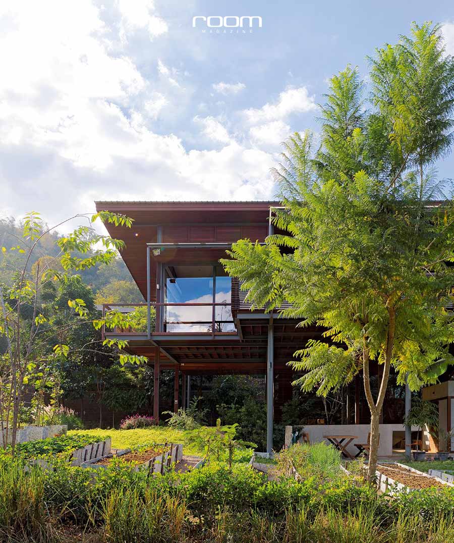 บ้านรูปร่างทันสมัยสไตล์โมเดิร์นหลังนี้ยกใต้ถุนสูง 3.40 เมตรคล้ายการสร้างบ้านเรือนไทยสมัยก่อน เพื่อแก้ปัญหาความลาดชันของพื้นที่และช่วยเปิดรับวิวเขาใหญ่ได้เต็มที่ ในเรื่องวัสดุใช้โครงเหล็กเป็นฐานและใช้ไม้จริงเป็นวัสดุปูพื้น ส่วนบริเวณห้องครัวและห้องน้ำเป็นคอนกรีตหล่อ แม้การเลือกใช้วัสดุจะแตกต่างกันในบางจุดแต่ก็สามารถเชื่อมอารมณ์เข้ากันได้อย่างลงตัวและกลมกลืนกับธรรมชาติรอบด้าน