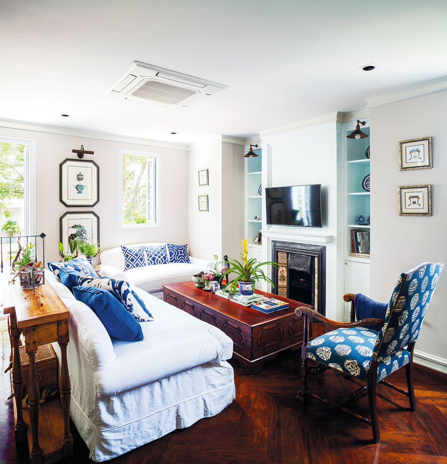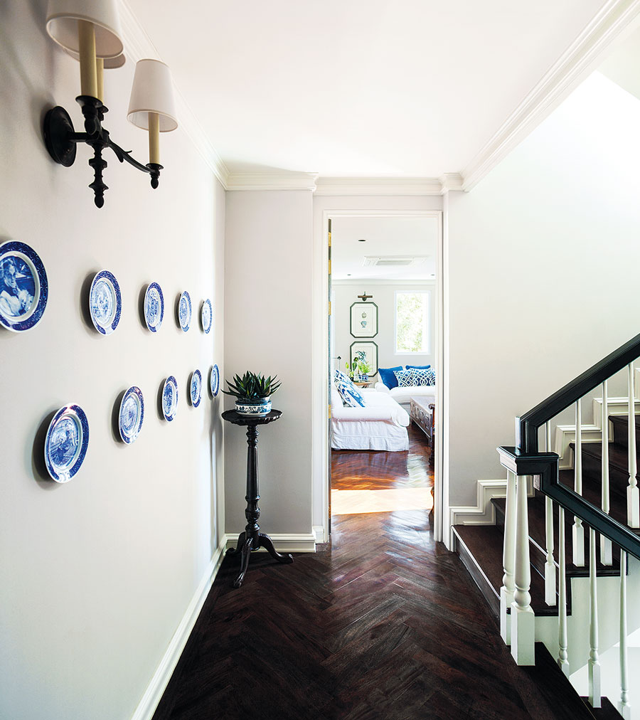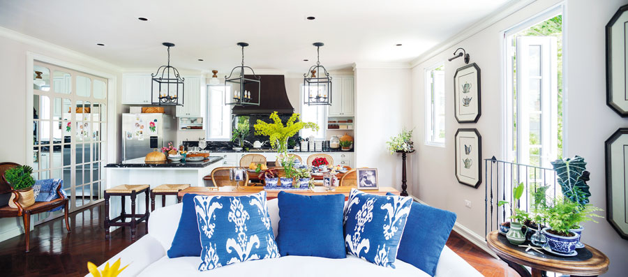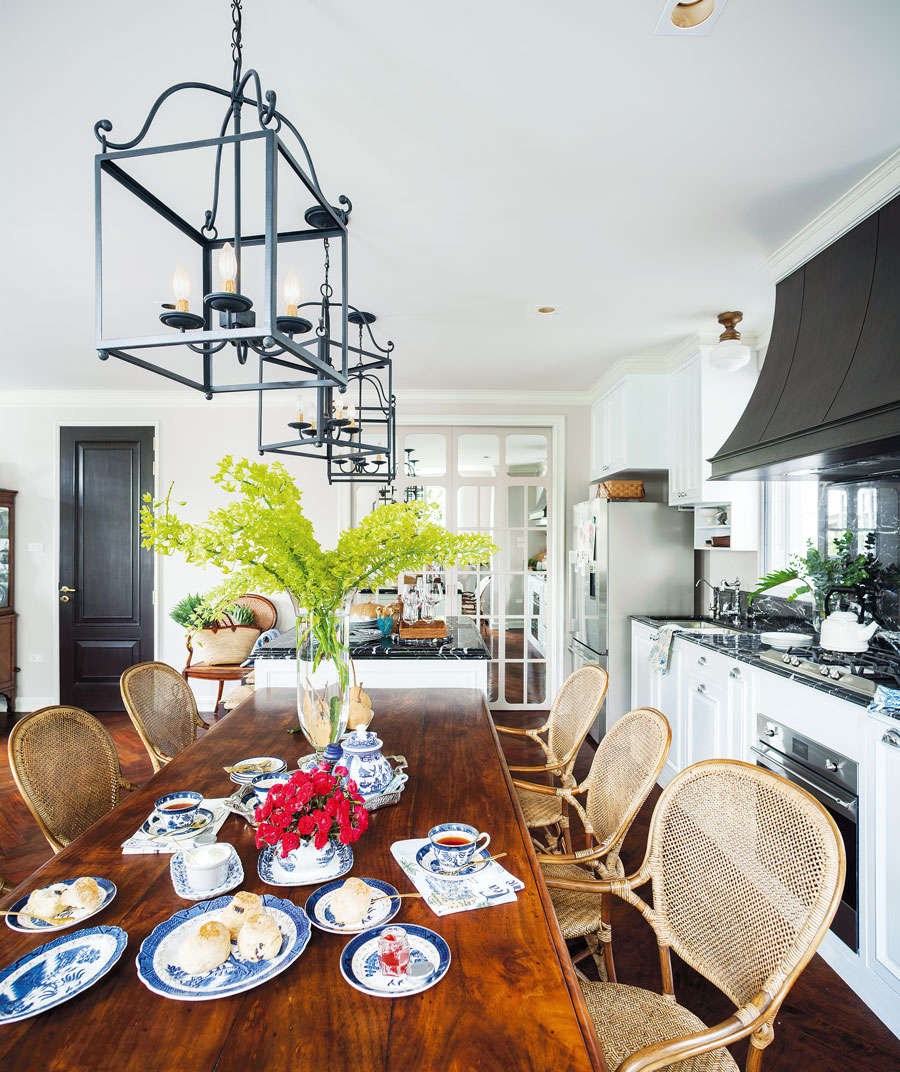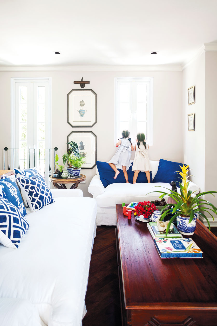 จุดเด่นของบ้านนี้จึงอยู่ที่การเลือกวางโครงสีในแต่ละพื้นที่ผ่านเฟอร์นิเจอร์และของตกแต่ง อาทิ โทนสีบูลแอนด์ไวท์จากของสะสมอย่างพวกเครื่องใช้ภาชนะและหมอนอิงในบริเวณชั้นสอง ในจุดที่ต้องการเติมความสดใสก็เลือกประดับด้วยภาพวาดแนวพฤกษศาสตร์ ซึ่งเกิดจากความชอบของคุณแนน “ชอบภาพวาดแนวนี้ เคยไปเที่ยวสวนคิวส์ที่อังกฤษก็ยิ่งเกิดแรงบันดาลใจ ทำให้สะสมภาพสไตล์นี้มาเรื่อยๆ โดยเฉพาะผลงานของอาจารย์พันธุ์ศักดิ์ จักกะพาก รวมถึงมีโอกาสได้ไปเรียนวาดภาพกับครูเต๋า (คุณสุนิตสรณ์ พิมพะสาลี) พอทำบ้านก็นำภาพเหล่านี้มาตกแต่งด้วยเลย” นอกจากนี้ยังเติมความอบอุ่นด้วยโทนสีธรรมชาติจากงานเฟอร์นิเจอร์หวายสาน จึงทำให้บรรยากาศโดยรวมของบ้านนั้นน่าอยู่และดูเรียบหรูในแบบของตัวเอง