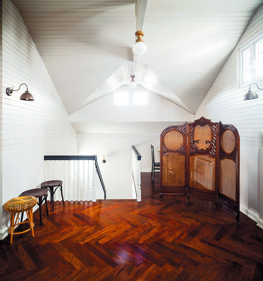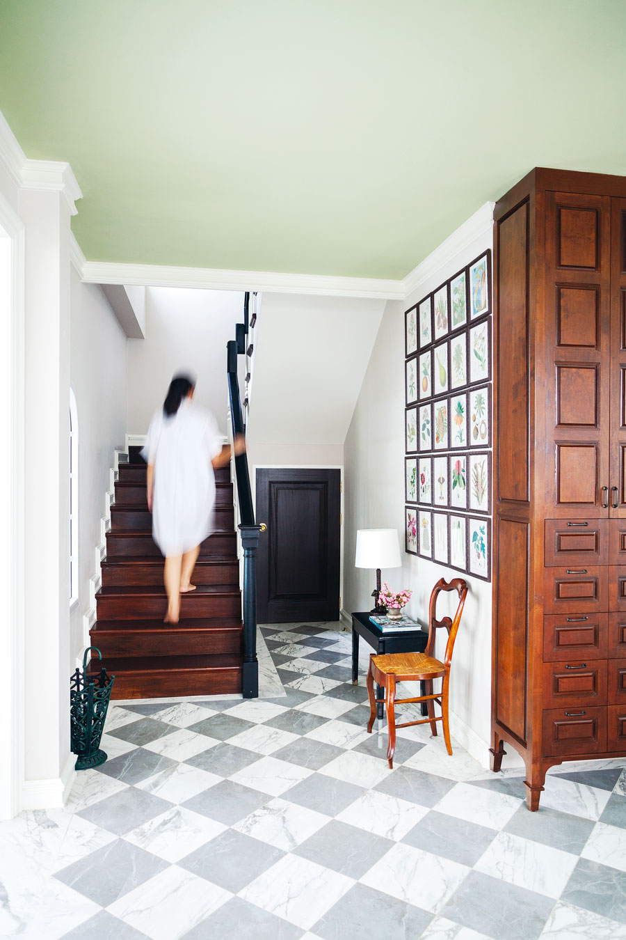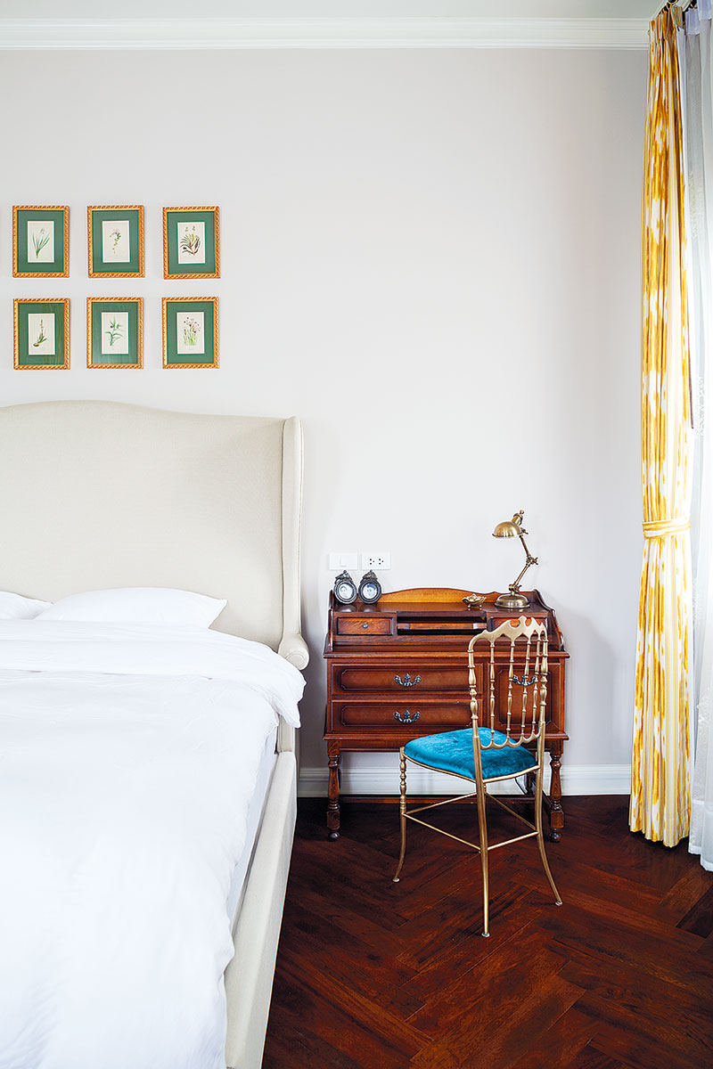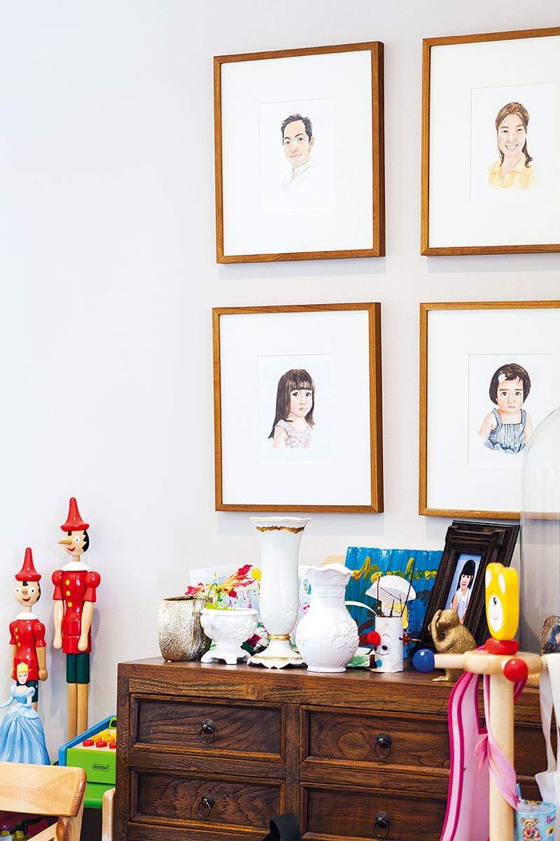 จุดเด่นของบ้านนี้จึงอยู่ที่การเลือกวางโครงสีในแต่ละพื้นที่ผ่านเฟอร์นิเจอร์และของตกแต่ง อาทิ โทนสีบูลแอนด์ไวท์จากของสะสมอย่างพวกเครื่องใช้ภาชนะและหมอนอิงในบริเวณชั้นสอง ในจุดที่ต้องการเติมความสดใสก็เลือกประดับด้วยภาพวาดแนวพฤกษศาสตร์ ซึ่งเกิดจากความชอบของคุณแนน “ชอบภาพวาดแนวนี้ เคยไปเที่ยวสวนคิวส์ที่อังกฤษก็ยิ่งเกิดแรงบันดาลใจ ทำให้สะสมภาพสไตล์นี้มาเรื่อยๆ โดยเฉพาะผลงานของอาจารย์พันธุ์ศักดิ์ จักกะพาก รวมถึงมีโอกาสได้ไปเรียนวาดภาพกับครูเต๋า (คุณสุนิตสรณ์ พิมพะสาลี) พอทำบ้านก็นำภาพเหล่านี้มาตกแต่งด้วยเลย” นอกจากนี้ยังเติมความอบอุ่นด้วยโทนสีธรรมชาติจากงานเฟอร์นิเจอร์หวายสาน จึงทำให้บรรยากาศโดยรวมของบ้านนั้นน่าอยู่และดูเรียบหรูในแบบของตัวเอง