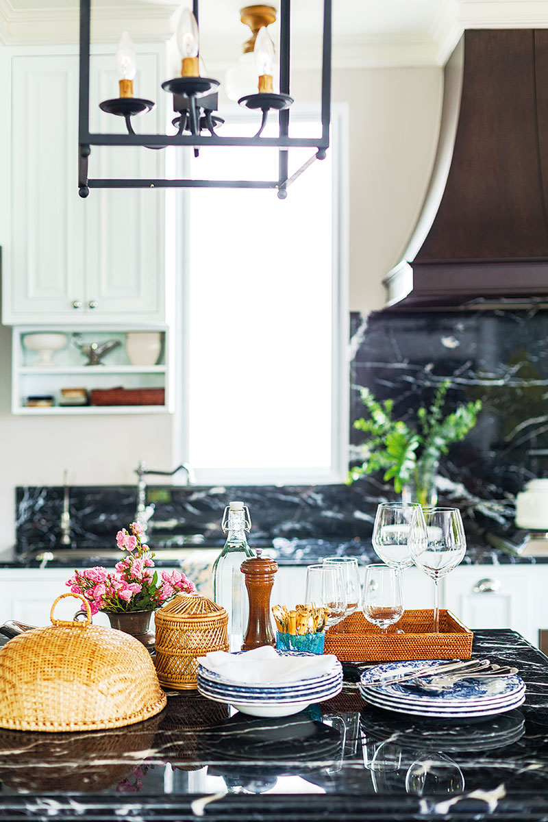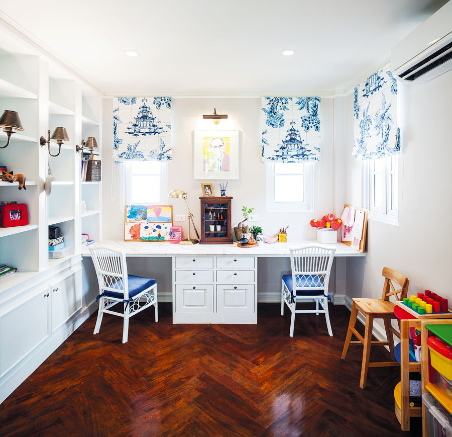 ส่วนเรื่องสไตล์การตกแต่งบ้านมีการพูดคุยและวางแผนกับผู้ออกแบบไว้ล่วงหน้า ยิ่งเมื่อได้มืออาชีพที่ถนัดสไตล์โมเดิร์นคลาสสิกอย่าง คุณเล็ก – นภาภรณ์ โพธิรัชต์ มาช่วย ก็ทำให้ภาพรวมของบ้านดูสวยงามลงตัว คุณแนนเล่าว่า “เรามีภาพในใจก่อนแล้วว่าอยากให้ห้องไหนเป็นแบบไหน ให้โจทย์คุณเล็กว่าห้องข้างล่างอยากได้สีเขียว ห้องข้างบนเป็นสีบลูแอนด์ไวท์ ส่วนห้องนอนเป็นสีเหลือง เพราะไปเดินที่จิม ทอมป์สันแล้วชอบผ้าลายสีนี้ ห้องลูกๆก็เป็นสีชมพู เราใช้สีเป็นตัวแบ่งการใช้งานของแต่ละห้องไปในตัว” ซึ่งโทนสีที่คุณแนนเลือกมีการปรับให้สีตุ่นลงเล็กน้อย เพื่อให้ทั้งบ้านดูสวยสบายตาและมีบรรยากาศผ่อนคลายยิ่งขึ้น