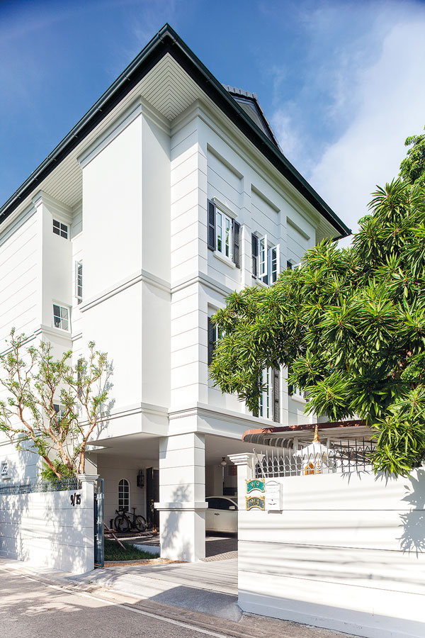 ตัวบ้านมีกลิ่นอายโมเดิร์นคลาสสิกแบบงานสถาปัตยกรรมยุโรป คุณแนนได้ไอเดียการตกแต่งจากการค้นหาภาพงานออกแบบสวยๆในเว็บไซต์ Pinterest เมื่อรวบรวมสไตล์ที่ชื่นชอบจริงๆได้แล้วก็ส่งภาพดังกล่าวให้สถาปนิกช่วยออกแบบเป็นบ้านสามชั้นที่มีห้องใต้หลังคาเล็กๆด้านบนเหมือนบ้านในต่างประเทศ