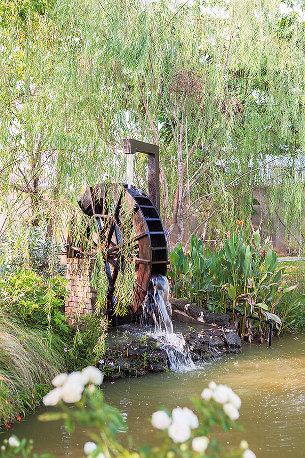 กังหันน้ำเป็นจุดนำสายตาหรือไฮไลต์ของสวนที่น่าสนใจ เพราะช่วยสร้างความเคลื่อนไหว ทำให้สวนดูไม่นิ่งจนเกินไป ได้ฟีลบ้านชนบทฝรั่ง และบรรยากาศที่โรแมนติก อีกทั้งยังช่วยเติมอากาศในน้ำให้ปลาได้อีกด้วย