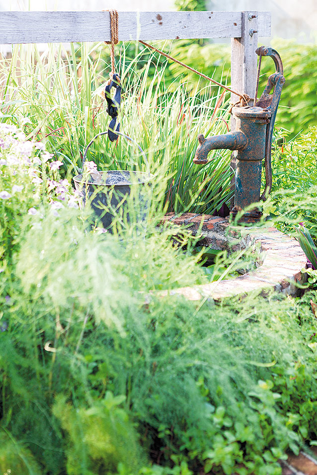 บ่อน้ำที่ประดับปั๊มโยกและราวแขวนถังสำหรับตักน้ำเป็นการจำลองบรรยากาศของสวนอังกฤษในแถบชนบท โดยพื้นที่รอบ ๆ อาจทำเป็นแปลงปลูกผัก หรือปลูกไม้ดอกผสมผสานกันให้ดูเป็นธรรมชาติ ส่วนกลางบ่ออาจเว้นว่างไว้ หรือปลูกไม้น้ำอย่างบัว กกแก้ว ลานไพลิน และเลี้ยงปลาไว้ในบ่อ เพื่อช่วยกำจัดยุง