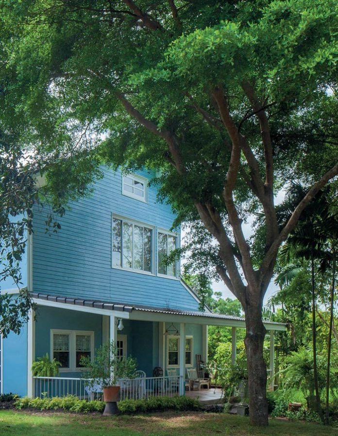 บ้านสีฟ้าสดใสท่ามกลางสีเขียวของต้นไม้ใบหญ้าและเจ้าไม้ใหญ่ที่สูงเลยหลังคาบ้านไปไกล พุ่มหนาๆ เป็นเหมือนแอร์ธรรมชาติชั้นเยี่ยมที่ช่วยบดบังแสงแดดที่แข่งกันสาดแสงอย่างไม่เกรงใจ