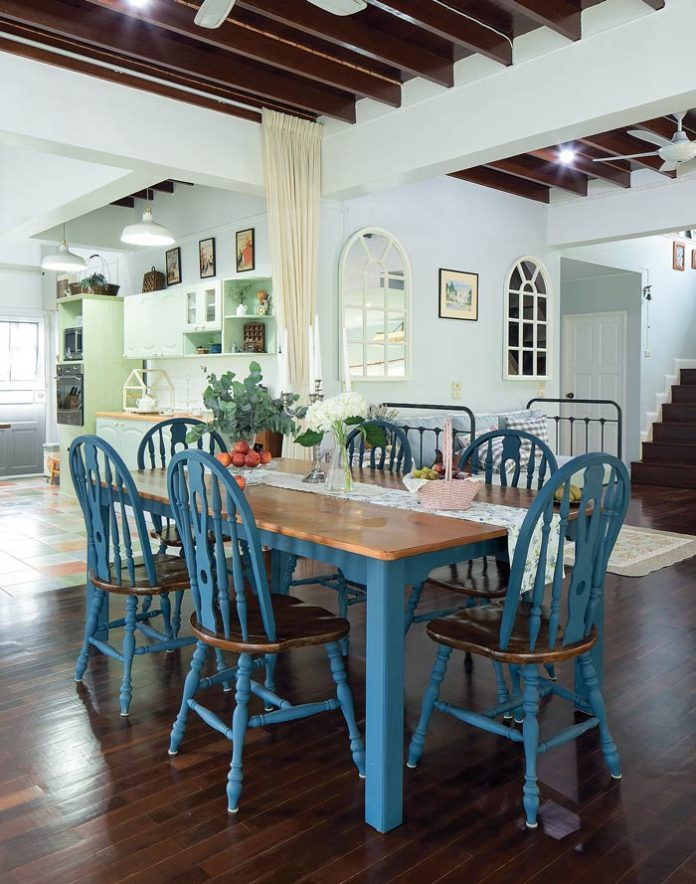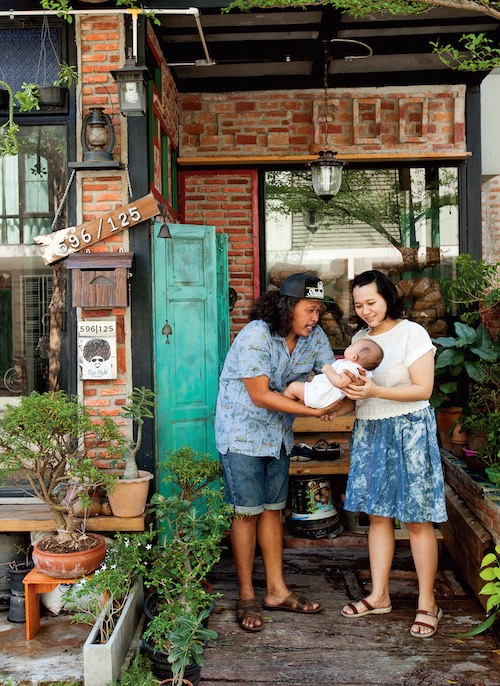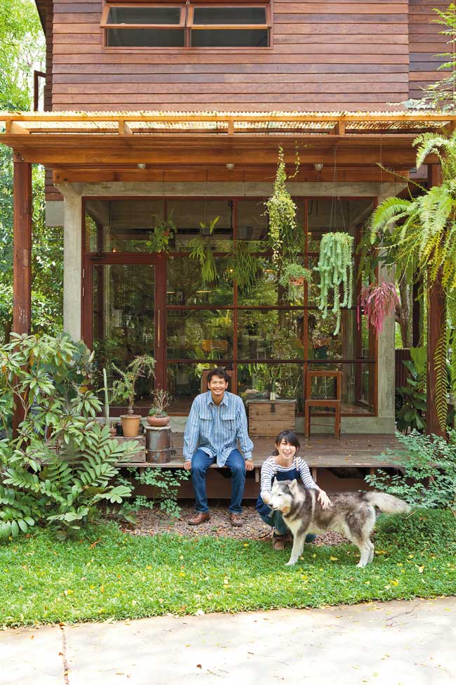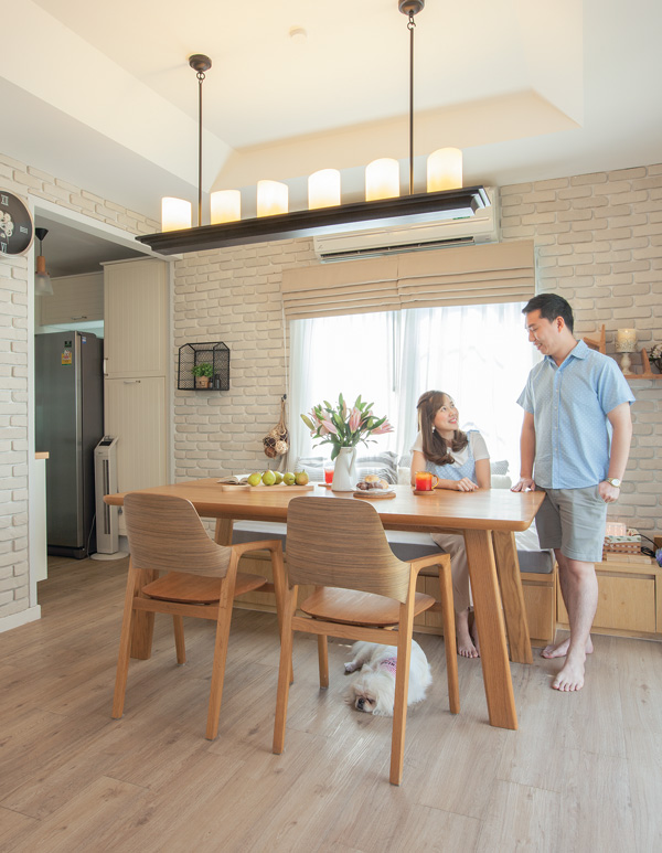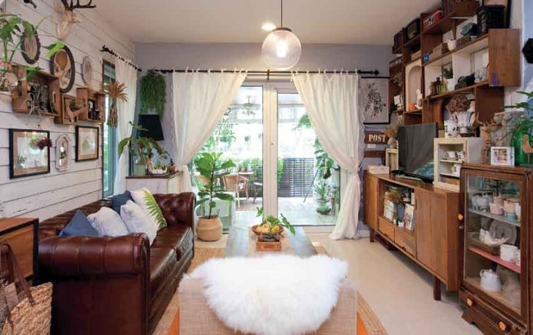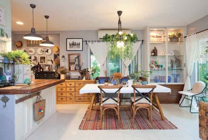 บ้านหลังนี้ซึ่งมีขนาดที่พอดี มีพื้นที่รอบๆ บ้าน อีกทั้งภายในโครงการยังเต็มไปด้วยต้นไม้ใหญ่ดูร่มรื่น ส่วนการตกแต่งบ้านพี่ไม่ได้มีกฎเกณฑ์ว่าจะต้องเป็นสไตล์อะไร แต่เริ่มจากการนำเอาความชอบของทุกคนมาเป็นตัวกำหนดแล้วจึงเติมรายละเอียดต่างๆ เข้าไป อย่างของเก่า ไม้เก่า รวมไปถึงงาน DIYต่างๆ ที่ช่วยกันทำขึ้นมา
