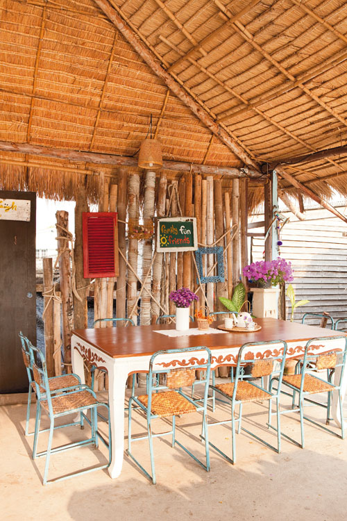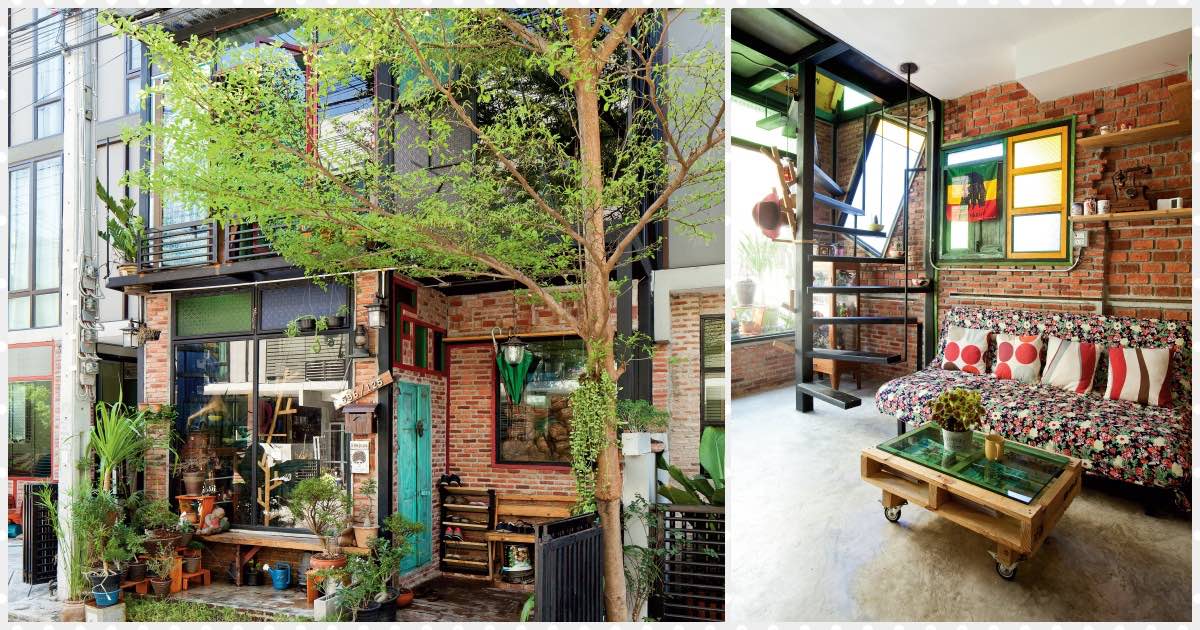 ด้วยการต่อเติมบริเวณภายนอกอาคารเพื่อเพิ่มพื้นที่ใช้สอยและมุมสวนขนาดย่อม ๆ ตกแต่งผนังด้วยการก่ออิฐมอญโชว์เนื้อแท้ของวัสดุที่มีสีสันสวย ๆ ผสมผสานเข้ากับประตู – หน้าต่างโบราณ เพิ่มกลิ่นอายของสไตล์คันทรี่ลอฟต์สะท้อนความเป็นตัวตนของเจ้าของบ้านได้เป็นอย่างดี