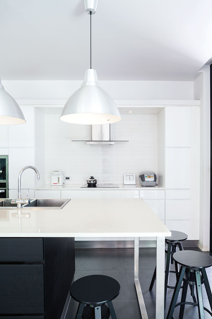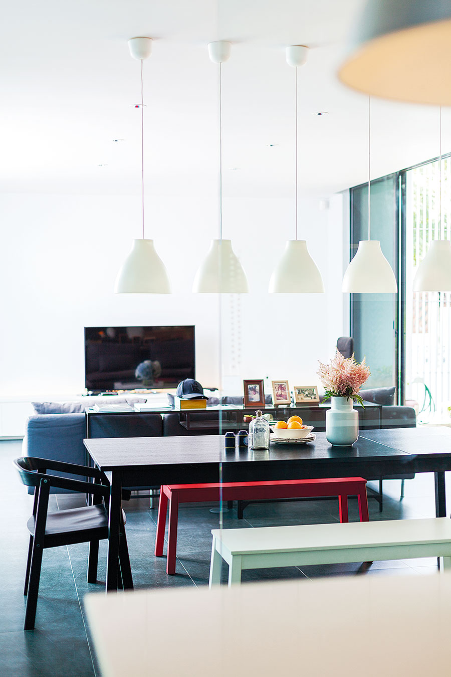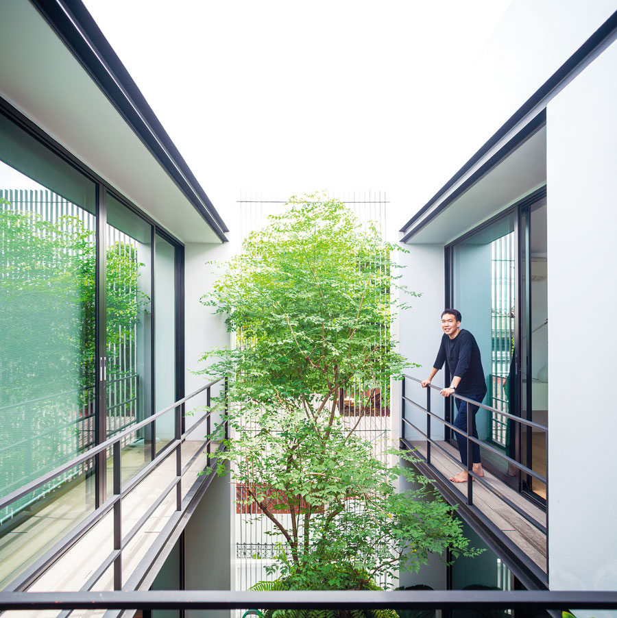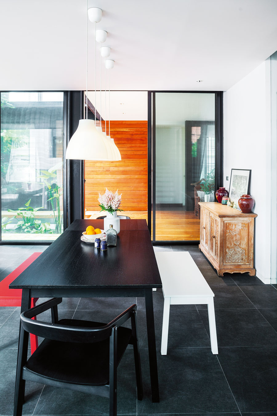 “สร้างบ้านให้ตัวเองมีความง่ายกว่าสร้างให้ลูกค้าอยู่แล้ว” คุณโป้งกล่าวต่อในฐานะของสถาปนิกแห่งบริษัท A49 “เพราะเวลาออกแบบบ้านให้ลูกค้า เราต้องคิดถึงสไตล์ก่อน แต่บ้านตัวเองนี่เก็บเรื่องสไตล์ไว้สุดท้ายเลย (หัวเราะ) แล้วไปเน้นที่ประโยชน์ใช้งานของทุกคนในบ้าน ซึ่งมีกันอยู่ 6 คน จะออกแบบบ้านอย่างไรบนที่ดินขนาด 96 ตารางวา จะทำอย่างไรให้รู้สึกโล่ง และทำอย่างไรให้แต่ละห้องมีการระบายอากาศที่ดี แตกต่างไปจากบ้านหลังเก่าที่มีสวนอยู่ด้านหน้า ทำให้ห้องพักผ่อนของทุกคนทับซ้อนกันอยู่ด้านหลัง จึงขาดทั้งวิวและความปลอดโปร่ง ผมเลยแก้ปัญหานี้ก่อนด้วยการออกแบบบ้านให้มีคอร์ตเล็กๆ แทรกระหว่างบ้าน เพื่อทำให้ทุกห้องในบ้านดูโปร่งและมีวิวเชื่อมต่อกับธรรมชาติได้พอๆ กัน”