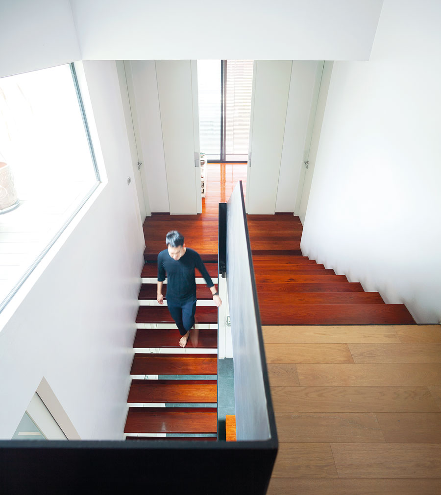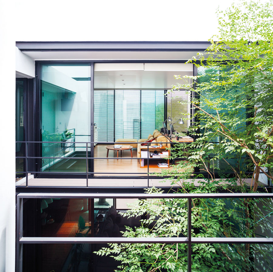 พื้นที่ใช้สอยทั้งหมดภายในบ้านประมาณ 450 ตารางเมตร ตั้งแต่ลานจอดรถไปจนถึงด้านใน เน้นถึงความโปร่งสบายที่เชื่อมต่อถึงกันได้หมด เพราะผนังหลักของบ้านกรุกระจกใส ประกอบกับโครงสร้างเหล็กซึ่งช่วยให้ก่อสร้างได้รวดเร็วและไม่จำเป็นต้องมีเสาคอนกรีตหนาๆ อยู่ภายในบ้าน ทำให้กรอบประตูหน้าต่างกลมกลืนไปกับโครงสร้างที่เบาบางของเหล็กได้ดี เมื่อเปิดพื้นที่คอร์ตกลางบ้านให้เป็นสวนขนาดกะทัดรัดพร้อมชานไม้นั่งเล่น จึงทำให้เกิดช่องรับลมธรรมชาติที่หมุนเวียนเข้าภายในบ้านได้ตลอดวันจนไม่จำเป็นต้องติดเครื่องปรับอากาศ แถมยังทำให้ห้องนอนด้านในมีวิวที่เชื่อมต่อกับสวนไปในตัว