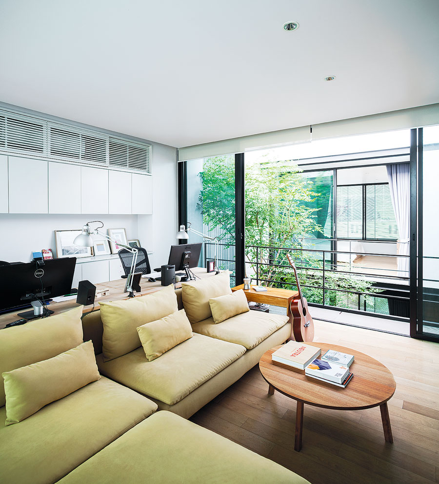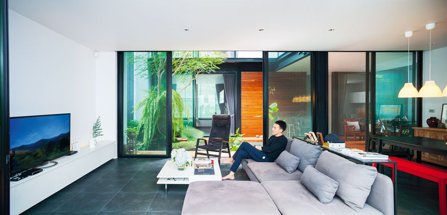 การเปิดพื้นที่ให้เชื่อมถึงกันระหว่างห้องนั่งเล่น ห้องอาหาร และคอร์ตกลางบ้าง รวมไปถึงห้องนอนคุณพ่อคุณแม่ด้านในนั้นนอกจากได้ความโปร่งสบายตาแล้ว ยังทำให้เห็นความเคลื่อนไหวของสมาชิกทุกคนในบ้านได้อย่างดี เอื้อต่อการสร้างปฏิสัมพันธ์ระหว่างกัน สร้างความรู้สึกอบอุ่นใจ แม้แต่ห้องทำงานและห้องนอนของคุณโป้งที่อยู่บนชั้นสอง ก็โปร่งด้วยผนังกระจกใสจึงสามารถมองเห็นพื้นที่ชั้นล่างได้อย่างสบายใจเช่นกัน