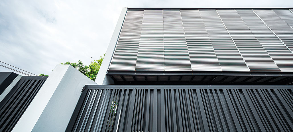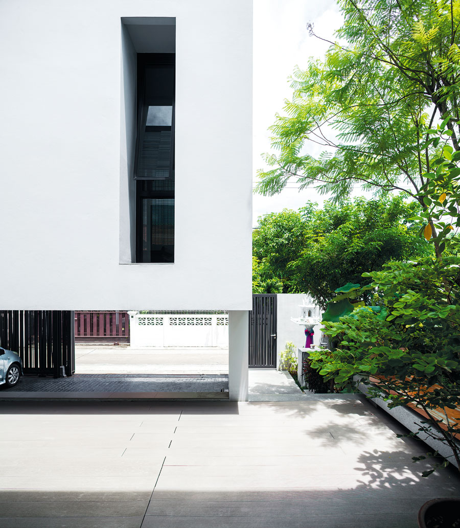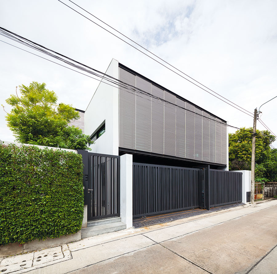 “ด้วยทิศทางเดิมของบ้าน ทำให้เราไม่สามารถวางบ้านขวางตะวันเพื่อหลบเลี่ยงแสงแดดและความร้อนได้ แถมบ้านเรายังเล็กจะยื่นชายคายาวก็ไม่ได้ เลยต้องใช้ระแนงอะลูมิเนียมช่วยบังแดดที่ส่องเข้าทางหน้าบ้านเต็มๆ ที่เห็นจึงไม่ได้ทำไว้ให้ดูสวยอย่างเดียว แต่ใช้งานได้จริงจังด้วย”