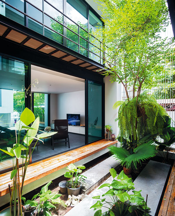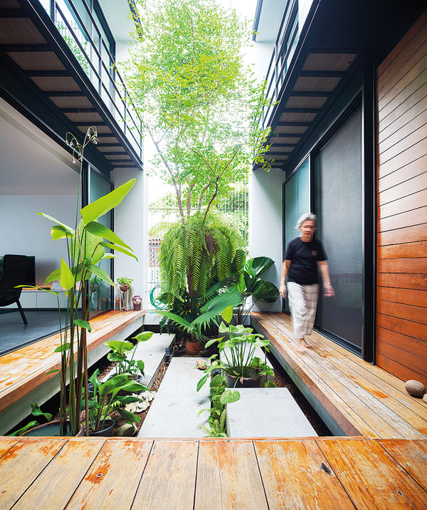 “ผมทำทางเดินเชื่อมต่อระหว่างคอร์ตกลางบ้านให้เป็นที่นั่งเล่นได้ด้วย โดยใช้ไม้เดิมที่มีอยู่กับไม้จากบ้านเก่าผสมกันระหว่างไม้สักกับไม้มะค่า ทำให้สีและขนาดอาจไม่ค่อยเท่ากันนัก แต่เราไม่ได้ซีเรียส ตรงนี้ กลายเป็นว่าคุณแม่กับคุณน้าชอบมาก เพราะเป็นมุมที่รับลมสบาย ไม่มีผนังปิดทึบ แต่ใช้ระแนงเหล็กกั้นเป็นผนังและรั้วเพื่อความปลอดภัยแทน เพื่อคงความโปร่งโล่งในบ้านไว้ด้วย แล้วปลูกต้นไม้ใหญ่เพิ่มความร่มรื่น มีปีบที่ให้ดอกหอมเป็นหลัก มีกันเกราที่โตช้าหน่อย แล้วก็ยังมีศรีตรังที่ให้ดอกสีม่วงสวย เสริมด้วยไม้กระถางอื่นๆ แม้ว่าเวลาฝนตกหนักอาจมีเปียกบ้าง แต่ก็เย็นสบาย ดีกว่าปิดทึบไปทั้งหมดครับ”