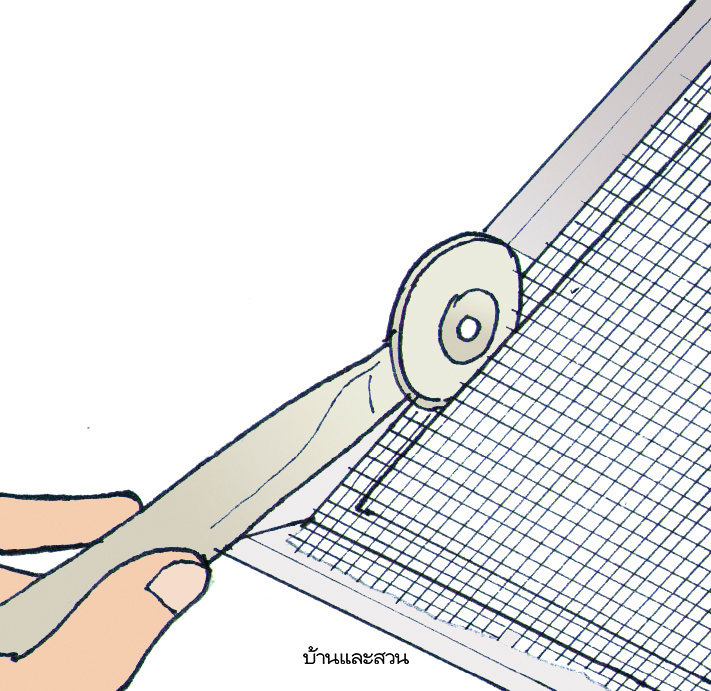 3 ใช้ที่รีดขอบยางกดมุ้งลวดไปตามขอบบานทั้ง 4 ด้าน จากนั้นใส่ยางลงบนขอบบานมุ้งลวดและใช้ที่รีดขอบยางค่อยๆ กดลงไปให้แน่นอีกครั้ง
