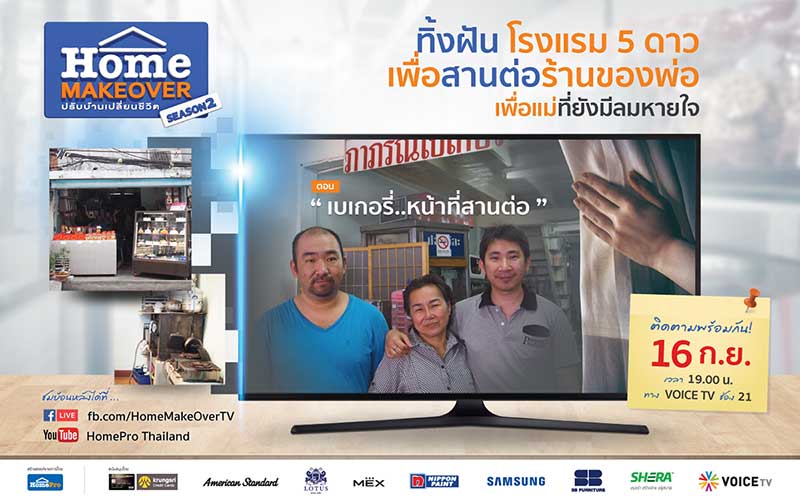 เข้าสู่สัปดาห์ที่สองของรายการเรียลลิตี้เรื่องบ้านรายแรกและรายการเดียวในประเทศไทย “Home MakeOver ปรับบ้าน..เปลี่ยนชีวิต ปี 2” ในสัปดาห์นี้จะพาไปพบกับครอบครัวของคุณวิสุทธิ์ ที่อาศัยอยู่ในตึกแถวเก่าแก่กว่า 30 ปี โดยใช้ที่นี่เป็นทั้งที่พักอาศัย ของสมาชิกในครอบครัว และเป็นร้านเบเกอรี่ แต่ด้วยพื้นที่ขนาดเล็กมากเพียง 36 ตร.ม. ทำให้การจัดสรรพื้นที่ไม่ตอบโจทย์ทุกความต้องการ งานนี้ทีมงาน Home Service จะสามารถเนรมิตความต้องการให้ตรงใจสมาชิกในครอบครัวได้อย่างไรในพื้นที่จำกัด ติดตามได้ใน “Home Makeover ปรับบ้าน…เปลี่ยนชีวิต” Season 2 ในวันเสาร์ที่ 16 กันยายน 2560 เวลา 19.00 น. ทาง VOICE TV