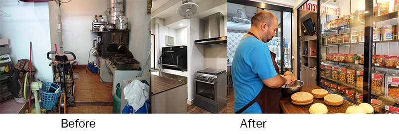 ส่วนทำขนมที่ปรับย้ายมานี้ ทีมงานได้ดีไซน์โดยกั้นเป็นห้องกระจกใสแบบ open kitchen สมัยใหม่ไว้ด้านหน้า โดยแบ่งพื้นที่ย่อยเป็น 2 โซน คือ โซนร้อนและโซนเย็นสำหรับโซนร้อนใช้อบขนมจะอยู่ด้านหน้าร้านเพื่อให้กลิ่นหอมของขนมอบใหม่ดึงดูดลูกค้า โดยติดตั้งพัดลมดูดอากาศช่วยระบายความร้อนให้อากาศถ่ายเทได้ดียิ่งขึ้น และติดตั้งประตูบานเลื่อนกั้นระหว่างโซนร้อนอบขนมกับโซนเย็น ซึ่งใช้เป็นส่วนเตรียมทำขนมและแต่งหน้าเค้กออกจากกัน พร้อมติดฟิล์มอำพรางสายตาในบางส่วนของห้อง ทำให้ร้านดูโปร่งสบายตา ขนมที่จัดวางก็ดูน่ารับประทานขึ้น ลูกค้าที่ผ่านไปมาสามารถมองเห็นการทำขนมได้ทุกขั้นตอน ช่วยเพิ่มมูลค่าสินค้าและสร้างความมั่นใจว่าขนมที่ขายในร้านนี้สดใหม่อยู่เสมอ