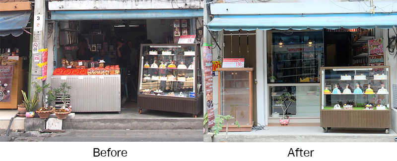Afterย้ายส่วนทำขนมมาอยู่ในห้องกระจกใสด้านหน้าร้าน และเพิ่มความน่าสนใจให้สินค้าด้วยตู้กระจกดีสเพลย์