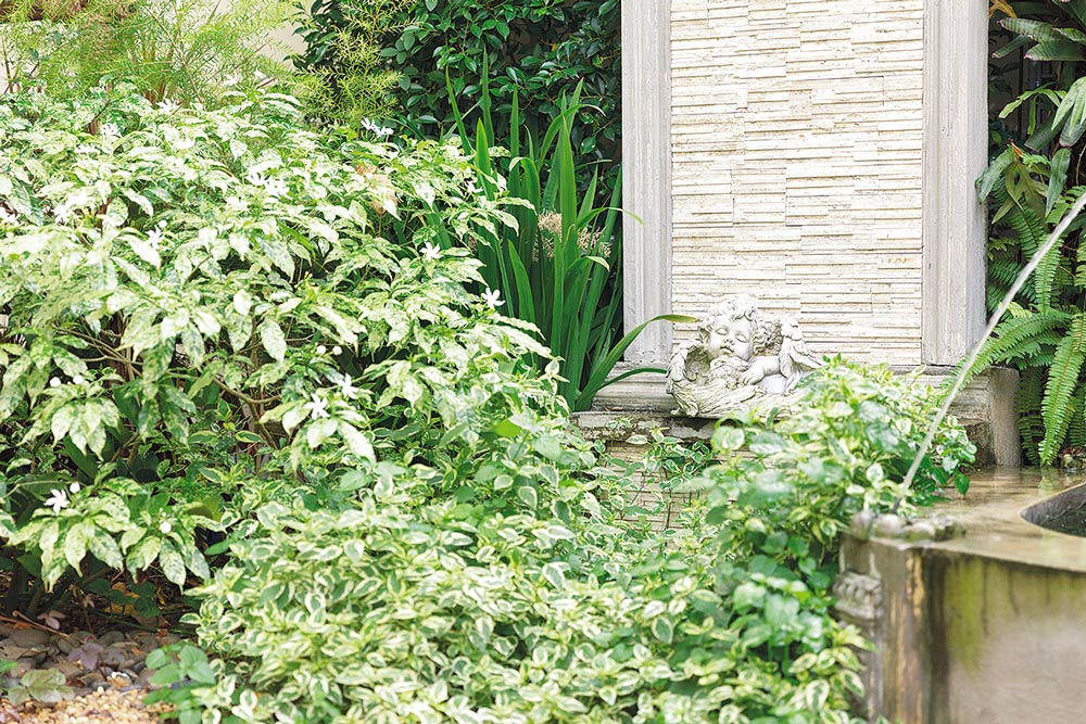 “ผมชอบเดินทางไปดูการแข่งขันฟุตบอลที่อังกฤษ มีโอกาสเห็นสวนสไตล์อังกฤษอยู่บ่อยครั้ง ซึ่งให้ความรู้สึกสงบและร่มรื่นดี พอได้เห็นน้ำพุนี้เราก็ชอบทั้งสีและรูปทรง จึงซื้อมาวางในสวนก่อนเลย นอกจากนี้ผมยังต้องทำงานข้างนอก ไม่ค่อยมีเวลาดูแลต้นไม้ ระบบทุกอย่างในสวนจึงเป็นแบบอัตโนมัติ เช่น ระบบสปริงเกลอร์ และระบบไฟในตอนกลางคืน รวมถึงชอบต้นไม้ที่มีรูปฟอร์มสวยแต่ไม่ต้องดูแลเยอะ” คุณบรรพตเล่าถึงโจทย์ความต้องการ
