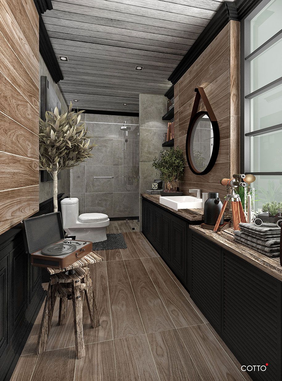 เมื่อนึกถึงธรรมชาติ ลวดลายไม้น่าจะเป็นสิ่งที่ตอบโจทย์สไตล์ความดิบเท่แบบผู้ชายได้ เพราะโทนสีของไม้ตามธรรมชาติ นั้นมีทั้งเฉดสีอ่อนแก่ไล่เรียงสลับกันไป การเลือกใช้ลายไม้โทนสีเข้มให้ความรู้สึกคลาสสิก และยังสามารถเพิ่มความลึกลับทรงเสน่ห์ภายในห้องด้วยการนำมาใช้เป็นวัสดุปิดผิวหน้าบานตู้สีเข้ม คุมโทนสีเอิร์ธโทน เลือกสุขภัณฑ์ที่มีรูปทรงที่โค้งมนให้ความอบอุ่นอ่อนโยน ข้อดีของการใช้กระเบื้องลายไม้ ง่ายต่อการดูแลรักษา หมดกังวลเรื่องเชื้อราที่อาจเกิดในพื้นที่อับชื้นของห้องน้ำ และแน่นอนหากอยากปลุกความสดชื่นก่อนไปทำงาน เปิดเพลงจากเครื่องเล่นแผ่นเสียงสักหน่อย พร้อมลุยแน่ๆ