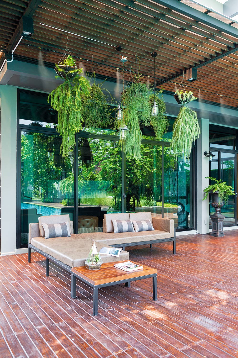 “พอเป็นพื้นที่โล่งก็อยากให้มีองค์ประกอบที่สร้างจุดเด่นให้มุมนี้บ้าง เลยใส่แบ็กกราวนด์ให้สระว่ายน้ำด้วยฉากประดับแบบโปร่ง สามารถมองทะลุเห็นไทรอินโดที่ซ้อนอยู่ด้านหลังอีกชั้น ตรงกลางของฉากเว้นช่องไว้วางกระถางเอิร์นประดับแซมด้วยไม้ดอกช่วยเพิ่มสีสัน และมีพื้นทำเป็นลายตารางหมากรุกด้วยแผ่นคอนกรีตปูสลับกับหนวดปลาดุกแคระเพิ่มกลิ่นอายความเป็นวินเทจเข้าไป ขณะเดียวกันก็ยังคุมโทนสีให้เข้ากับตัวบ้านด้วย ฟังก์ชันอีกอย่างที่เพิ่มเข้าไปให้บริเวณที่นั่งใต้ระแนงคือติดตั้งระบบพ่นหมอกอัตโนมัติเพื่อช่วยลดอุณหภูมิในวันที่อากาศร้อนอบอ้าว”