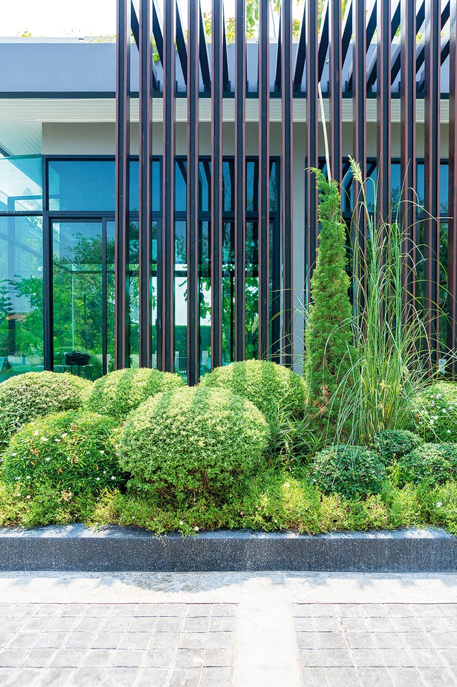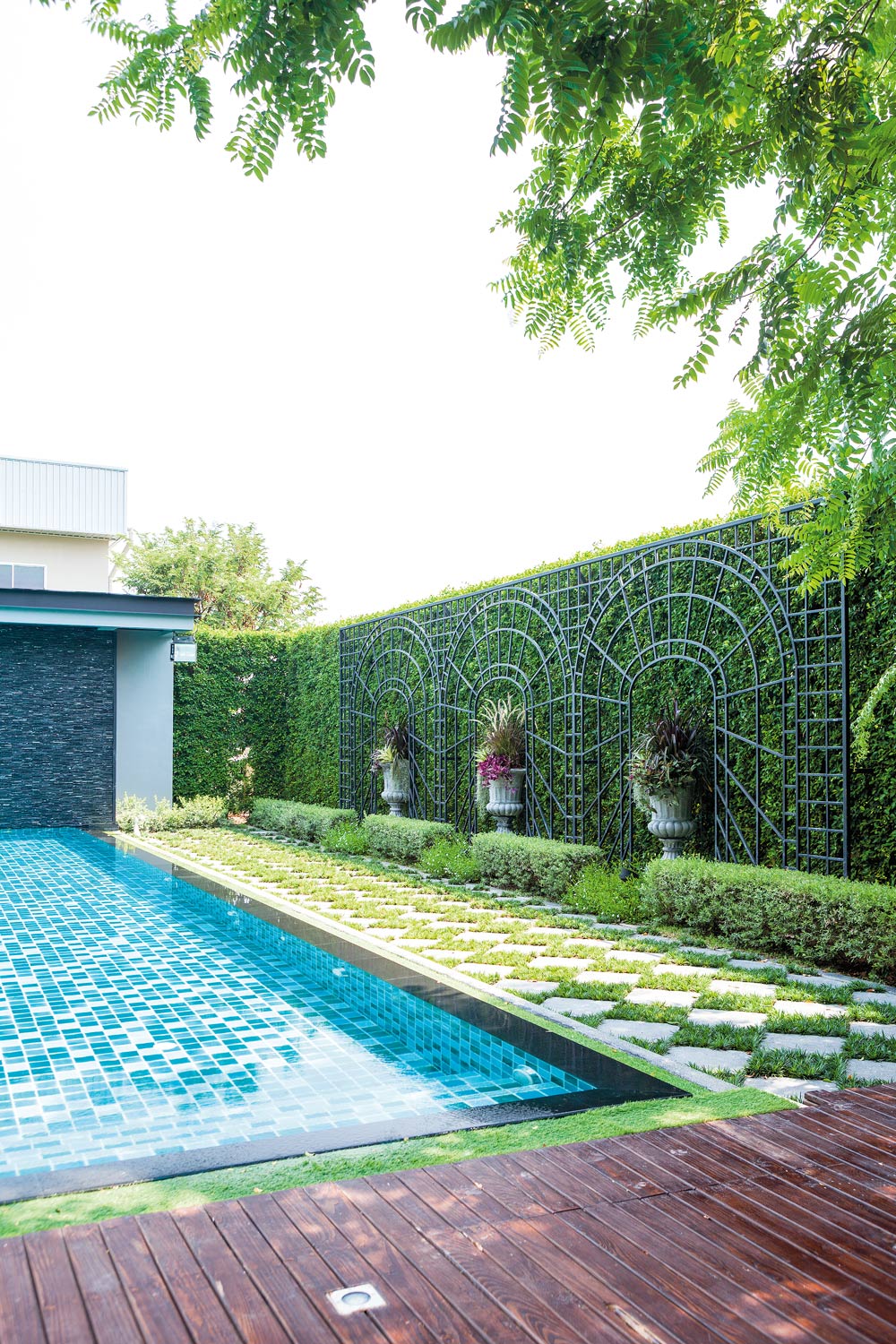 นักจัดสวนเล่าต่ออีกว่า “พอเดินผ่านซุ้มที่ปูทางเดินค็อบเบิลสโตนและมีแปลงปลูกต้นไม้แบบผสมผสานกับสไตล์สวนอังกฤษที่ขนาบทั้งสองข้าง ก็จะพบกับโซนสระว่ายน้ำซึ่งมีอาคารโอบล้อมอย่างมิดชิดให้ความเป็นส่วนตัวแต่ก็เป็นพื้นที่เปิดโล่งที่มีไม้ใหญ่หลายต้น เช่น โมกมัน กระโดน จิกน้ำ ช่วยให้มุมนี้ดูร่มรื่นอย่างที่พี่ชายคุณนกต้องการ โดยเจ้าของบ้านเป็นคนเลือกซื้อไม้ใหญ่ทั้งหมดมาปลูกเอง แต่ก็มีปรับย้ายไปบ้าง เช่น หลิว ที่มีใบเล็กและร่วงง่าย ไม่เหมาะกับการปลูกไว้ใกล้ริมสระว่ายน้ำ เลยต้องย้ายไปปลูกไว้ที่ริมรั้วหน้าบ้านแทน”