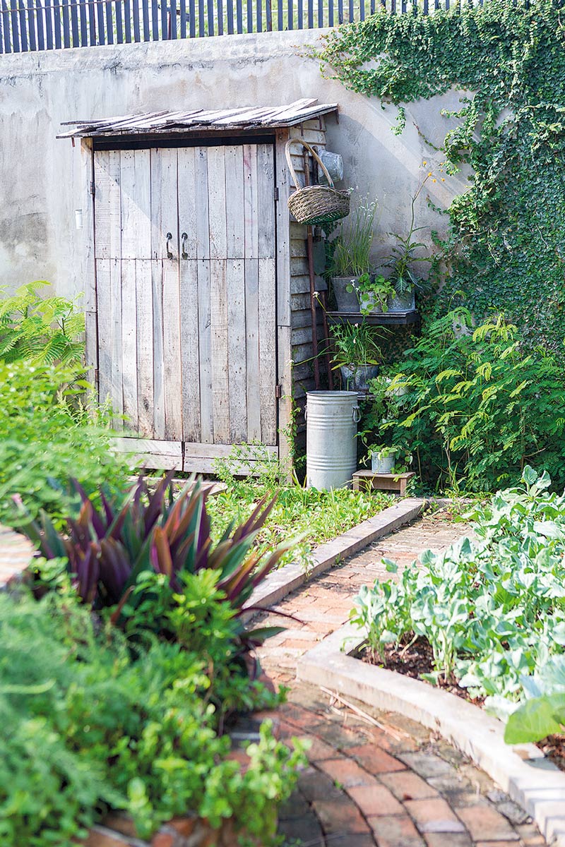 จากนั้นนักจัดสวนพาทีมงานเดินออกไปยังส่วนที่สองซึ่งแปลงผักสวนครัวตามโจทย์ที่เจ้าของบ้านต้องการ โดยนำรูปแบบสวนผักของอังกฤษในแถบชนบทมาใช้เป็นไอเดีย อย่างเช่น บ่อน้ำ ซุ้มไม้เลื้อย แปลงปลูกผักแบบสมมาตร รถเข็นล้อเดียว และที่เก็บอุปกรณ์ทำสวน “เป็นมุมที่คุณแม่ใช้ประจำเพราะต้องออกมาเก็บผักนำไปทำอาหารทุกเช้า บางทีก็เดินทำความสะอาดเก็บเศษใบไม้เหมือนได้ออกกำลังกายไปในตัว คุณแม่เคยบอกว่าถึงแม้ผักทุกต้นจะไม่สวยเหมือนตามท้องตลาด แต่ก็เป็นผักที่ปลูกเองทำเอง ไม่ใช้สารเคมีกินแล้วปลอดภัยกับลูกๆทุกคน เป็นมุมที่เรามักจะออกมาช่วยคุณแม่เก็บผักอยู่เสมอๆ บางทีเก็บผักเสร็จก็ไปเดินไปนั่งเล่นให้อาหารปลา ระหว่างที่คุณแม่กำลังแยกผักเตรียมไว้สำหรับทำกับข้าว” คุณนกกล่าว