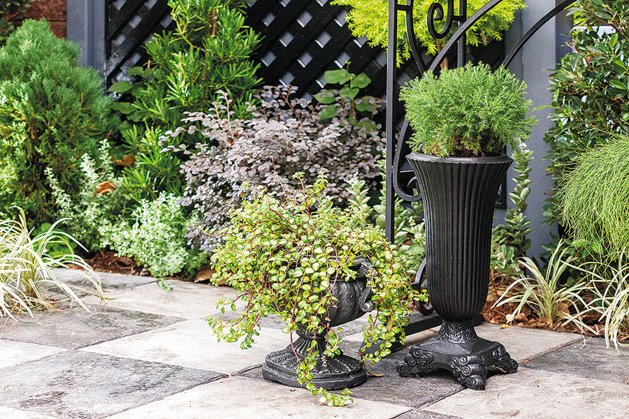 ต้นไม้ในแปลงคงไม้ฟอร์มให้อยู่ยาว ๆ ใช้สนที่มีใบละเอียด ดูฝรั่งหน่อย มีหลิวทอง สนแผง สนบอลิ สนไทรเงิน นีออน หงส์ฟู่ ให้เท็กซ์เจอร์และสีตัดกัน ปกตินุ่นไม่ใช้ไม้ดอกเพราะอายุสั้น แต่จะใช้ไม้ใบที่มีเท็กซ์เจอร์ต่างกัน แล้วเลือกไม้ดอกทนๆอย่างต้อยติ่งเทศ พยับหมอกโทนเทา ม่วง และชมพู ส่วนแปลงไหนที่ใช้ไม้ดอกล้มลุกก็เปลี่ยนได้ ในหนึ่งแปลงจะใช้ไม้ดอกล้มลุก 2 ชนิด ที่เหลือคือไม้ตัดแต่งตัดให้คงฟอร์มอยู่ได้นาน 2-3 เดือน ต้นที่เป็นไม้ล้มลุกพอโทรมก็ค่อยเปลี่ยนให้มีสีสันใหม่เฉพาะจุดไป คือเหลือที่ให้เขาเติมบ้าง