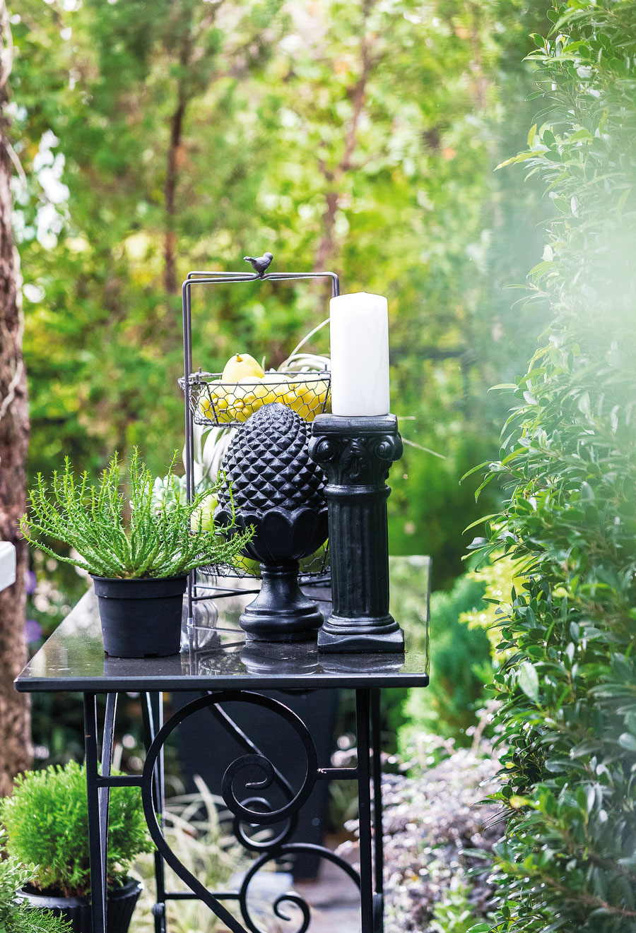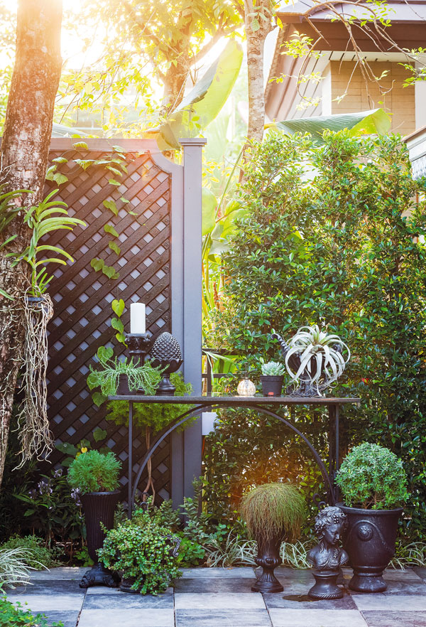 สวนหลังบ้าน เช้าวันอากาศฉ่ำฝน เรามาถึงบ้านในย่านชานเมืองหลังนี้ หมู่บ้านแห่งนี้ยังแวดล้อมด้วยเรือกสวนแบบวิถีของชาวฝั่งธนฯในอดีต เมื่อเข้ามาในสวนขนาดกะทัดรัดสไตล์อิงลิชคอตเทจจึงยังเห็นต้นมะพร้าวสูงลิ่วถัดออกไปนอกรั้วเพียงนิดเดียว พร้อมลมพัดโชยเย็นสบายตลอดทั้งวัน