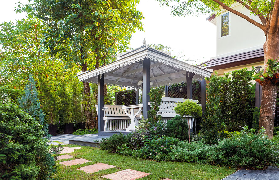 คุณปีโป้ : ศาลาเดิมตรงนี้โป้ซื้อมานานแล้ว เป็นศาลาไม้สไตล์ล้านนา ซึ่งตอนแรกศาลามันผุ เราคิดว่านุ่นต้องบอกว่ามันผุมากย้ายออกไหม แต่นุ่นให้ไอเดียว่าเปลี่ยนสี คือเราไม่นึกถึงเรื่องนี้เลย คิดไม่ถึงว่าแค่ทาสีก็เหมือนได้ศาลาใหม่ อารมณ์เปลี่ยนไปเลย ดูฝรั่งไปอีกแบบ ทั้งที่เป็นศาลาหลังเดิม แต่ตอนที่เลือกสีเราก็มาดู ฟีลลิ่งเวลานั่งข้างใน ไม่ได้ดูแต่ข้างนอก แล้ววันที่สรุปก็ตรงกันด้วยว่าเป็นศาลาสีเทา