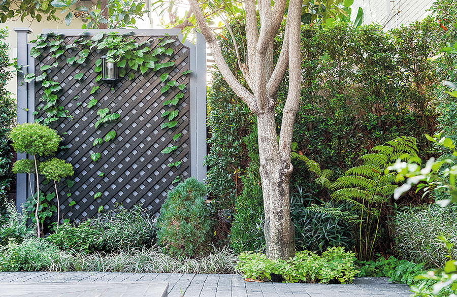 คุณนุ่น : พ้อยต์คือตรงห้องนั่งเล่นมีหน้าต่างบานใหญ่ ซึ่งดูเชื่อมต่อกับข้างนอกได้ คุณโป้ให้อิสระเต็มที่ ไม่ได้บีบแนวคิดนุ่น เราอุดจุดที่เป็นปัญหา เช่น แนวรั้วเป็นแผงไทรยาว แต่พื้นที่ร่มมากต้นไทรจะทิ้งใบทำให้ต้นบางส่วนโล่ง นุ่นเลยเบรกด้วยผนังประดับ ส่วนไทรเดิมย้ายไปไว้แนวกำแพงด้านหลังแทน