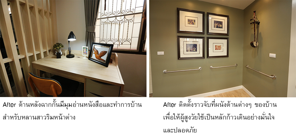 นอกจากนี้ได้กั้นพื้นที่ใต้บันไดปรับเป็นตู้เก็บของอเนกประสงค์ สำหรับห้องใหม่ด้านหน้าที่เปิดเชื่อมกับห้องรับแขก มีเตียงไว้ให้คุณพ่อใช้พักผ่อนดูทีวี หรือสามารถใช้เป็นห้องนอนของคุณแม่ได้ในอนาคต พร้อมทำมุมนั่งเล่นพิเศษให้คุณพ่อใช้พยุงตัวเมื่อต้องการเปลี่ยนเสื้อผ้าหรือผ้าอ้อมได้สะดวกยิ่งขึ้น รวมทั้งทำโต๊ะล้อเลื่อนสำหรับเก็บของใช้ส่วนตัวซึ่งคุณพ่อสามารถเลื่อนย้ายเองได้สะดวกโดยไม่ต้องเรียกคนอื่นหยิบให้เมื่อต้องการใช้งาน