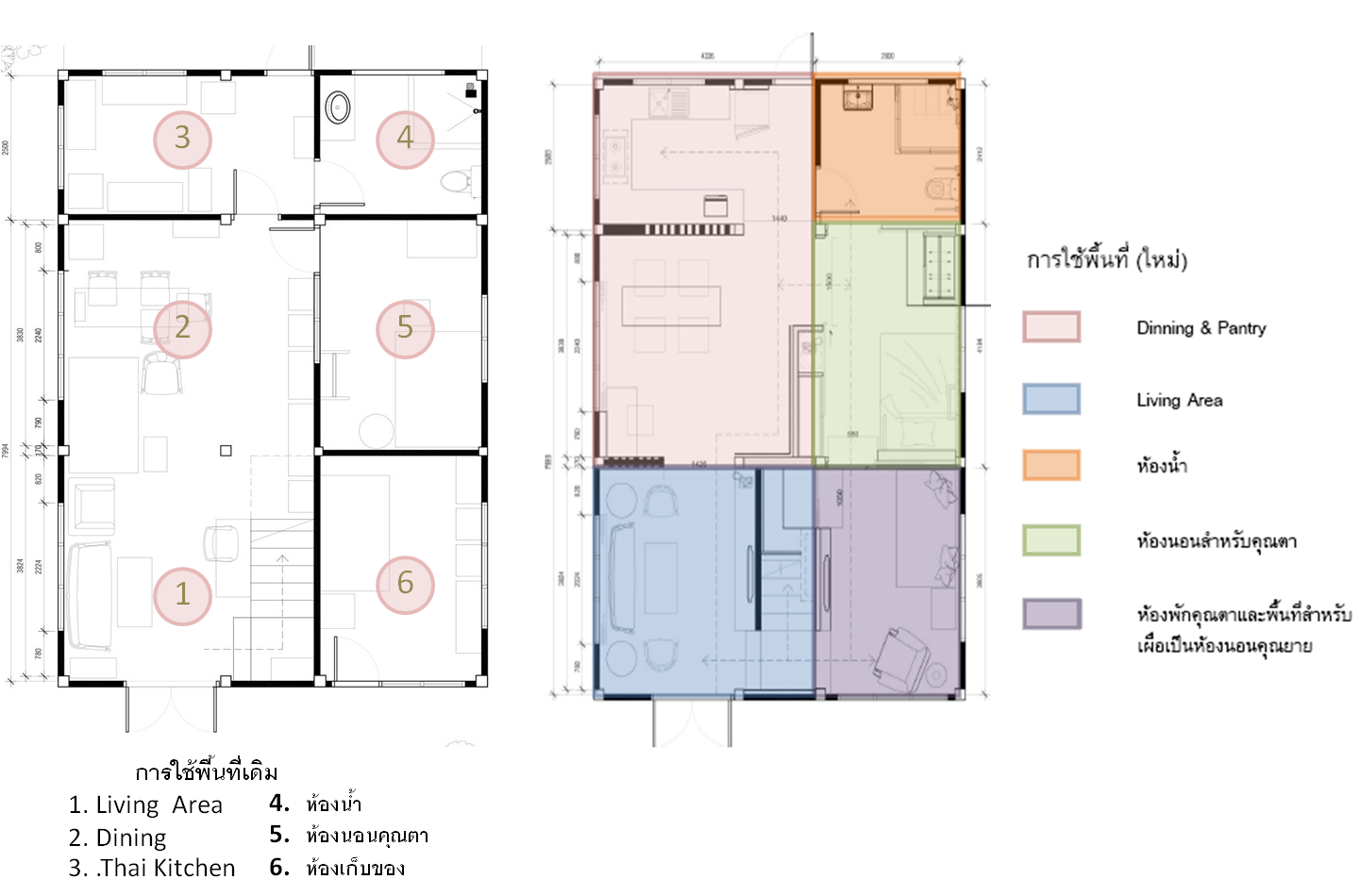 ครอบครัวคุณเพชรีเป็นครอบครัวหนึ่งที่ประสบปัญหานี้เช่นกัน เนื่องจากสมาชิกในบ้าน ซึ่งประกอบด้วย คุณพ่อวัย 87 ปี สุขภาพไม่แข็งแรงต้องนั่งวีลแชร์เกือบตลอดเวลา คุณแม่วัย 73 ปี ผู้ดูแลคุณพ่อ หลานสาวและคุณเพชรี อาศัยอยู่ในบ้าน 2 ชั้น ขนาด 50 ตารางวา ที่คุณพ่อสร้างขึ้นเมื่อ 35 ปีก่อน ปัจจุบันมีฟังก์ชั่นการใช้งานภายในบ้านไม่ตอบโจทย์ผู้สูงวัย ทำให้ลูกหลานเป็นห่วงเรื่องความปลอดภัยเมื่อคุณพ่อคุณแม่ต้องอาศัยอยู่กันเพียงลำพัง