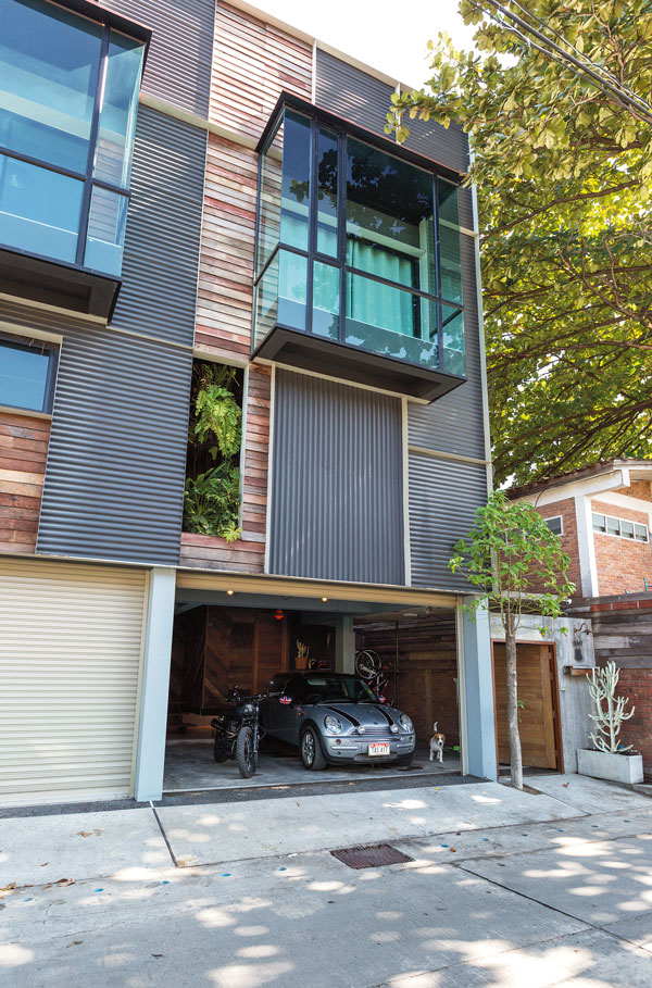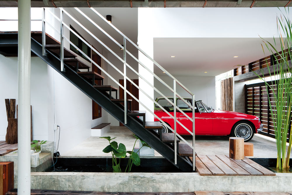 ออกแบบพื้นที่จอดรถโครงสร้างคอนกรีตเปลือยทำให้ดูแลรักษาง่าย ผนังส่วนที่เป็นบ้านกรุแผ่นเหล็กรีดบางเพื่อให้ดูน่าสนใจมากขึ้น ด้วยพื้นที่ขนาดนี้สามารถจอดรถได้ 2 คันอย่างสบายๆ