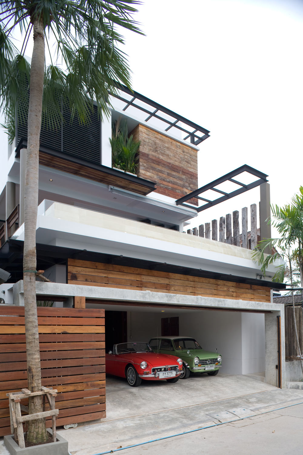 ใช้พื้นที่จอดรถเป็นส่วนหนึ่งของตัวบ้าน ซึ่งใช้พื้นที่ด้านล่างของตัวบ้าน ดังนั้นต้องออกแบบพื้นที่ข้างล่างให้มีลักษณะกึ่งทึบกึ่งโปร่งเพื่อการระบายอากาศที่ดี ส่วนชั้นบนให้เป็นพื้นที่ส่วนตัว เช่น ห้องนั่งเล่น ห้องนอน เป็นต้น