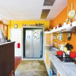 สำหรับบ้านตึกแถว ทาวน์เฮาส์ ที่ต่อเติมพื้นที่ใช้งานจนเต็ม ครัวนี้เหมาะเป็นอย่างยิ่งเพราะเป็นครัวที่ถูกสร้างขึ้นบนชั้นสองของบ้านตึกแถว โดยเราสามารถสร้างครัวรูปแบบนี้ให้อยู่บนชั้นหนึ่งได้ ครัวนี้ใช้บานเฟี้ยมกั้นพื้นที่จากส่วนอื่นๆลดปัญหาเรื่องกลิ่น ใช้กระเบื้องกรุตกแต่งเพิ่มความสวยงามสลับกับปูนเปลือยขัดมัน และใช้ตะแกรงเหล็กฉีกตกแต่งให้ดูเท่ยิ่งขึ้น สิ่งสำคัญของครัวนี้คือการวางระบบท่อให้ดูสวยงาม โดยอาจจะใช้ท่อระบายน้ำเดิมบริเวณระเบียงดาดฟ้าเป็นท่อน้ำทิ้งและต่อท่อน้ำดีจากห้องน้ำอีกที