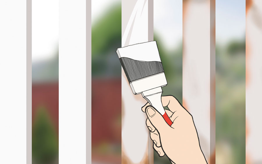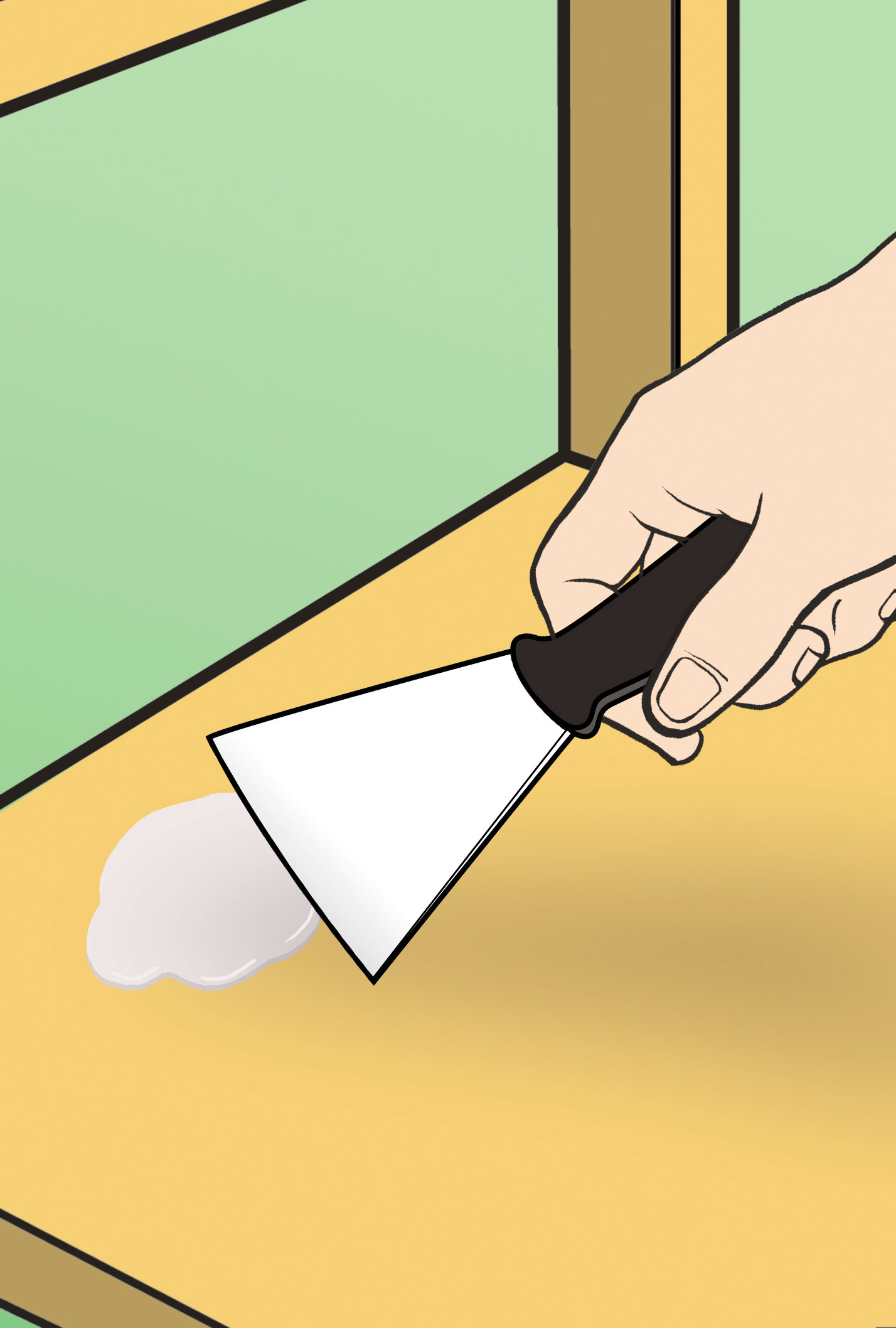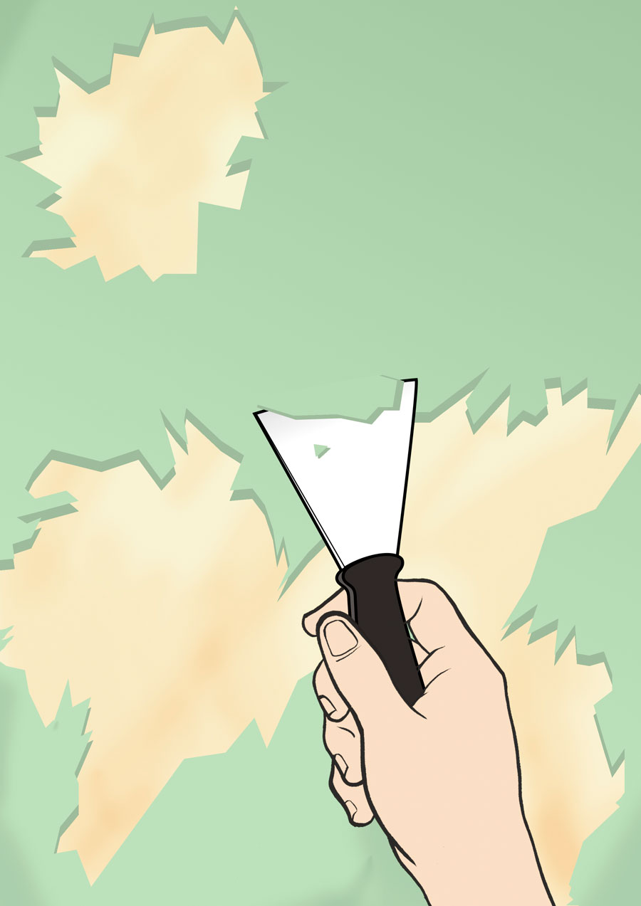 1 ใช้เกรียงโป๊ขูดฟิล์มสีที่เสื่อมสภาพหรือหลุดลอกออกให้หมด จากนั้นล้างทำความสะอาด แล้วปล่อยให้แห้ง