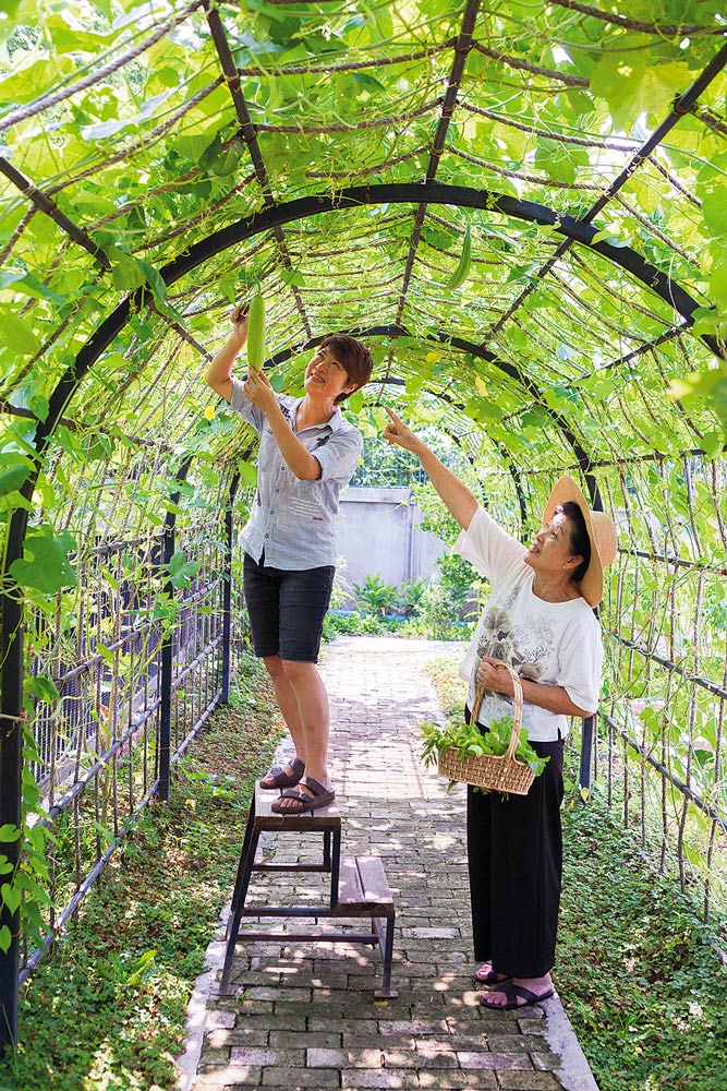 คุณนก ณัฐนิช อรุณรัติยากร เจ้าของบ้านเล่าว่าเล่าว่า “เป็นมุมที่คุณแม่ใช้ประจำเพราะต้องออกมาเก็บผักนำไปทำอาหารทุกเช้า บางทีก็เดินทำความสะอาดเก็บเศษใบไม้เหมือนได้ออกกำลังกายไปในตัว คุณแม่เคยบอกว่าถึงแม้ผักทุกต้นจะไม่สวยเหมือนตามท้องตลาด แต่ก็เป็นผักที่ปลูกเองทำเอง ไม่ใช้สารเคมีกินแล้วปลอดภัยกับลูกๆ ทุกคน เป็นมุมที่เรามักจะออกมาช่วยคุณแม่เก็บผักอยู่เสมอๆ บางทีเก็บผักเสร็จก็ไปเดินไปนั่งเล่นให้อาหารปลา ระหว่างที่คุณแม่กำลังแยกผักเตรียมไว้สำหรับทำกับข้าว” ผักไม้เลื้อยอย่างบวบก็มีซุ้มโครงเหล็กรองรับ ส่วนแปลงผักใช้อิฐมอญก่อเป็นแปลงชัดเจน ตกแต่งให้ดูน่ามองแบบสวนวินเทจด้วยของเก่า อาทิ โรงเก็บอุปกรณ์ ป้ายไม้ ไฟสนาม เป็นต้น