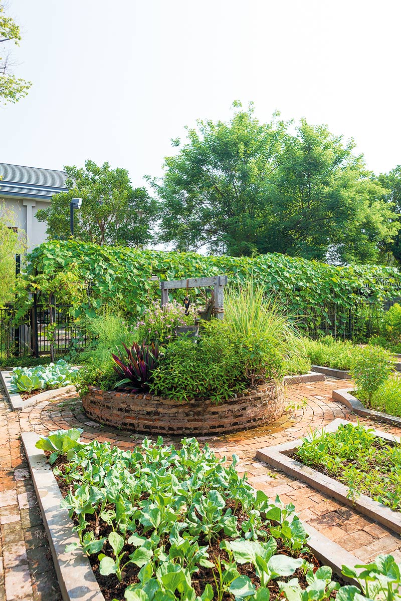 เนื้อที่กว้างกว่า 3 ไร่ของบ้านสวนหลังนี้จัดเป็นแปลงผักสวนครัวตามโจทย์ที่เจ้าของบ้านต้องการ โดยนำรูปแบบสวนผักของอังกฤษในแถบชนบทมาใช้เป็นไอเดีย อย่างเช่น บ่อน้ำ ซุ้มไม้เลื้อย แปลงปลูกผักแบบสมมาตร รถเข็นล้อเดียว และที่เก็บอุปกรณ์ทำสวน