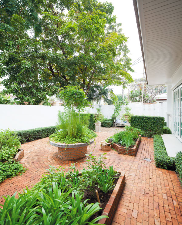 กิจกรรมสำหรับลูกๆ ในตอนเช้า เป็นเหมือนอีกหนึ่งโจทย์ของการเลือกจัดสวนสไตล์โมเดิร์นวินเทจแห่งนี้ แปลงผักมุมข้างบ้านจึงเป็นมุมกิจกรรมที่ลูกๆ ของคุณนงลักษณ์ สุภดนัยสร ซึ่งสวนผักแห่งนี้ใช้ทฤษฎีการจัดวางองค์ประกอบแบบสวนฟอร์มัล คือจัดวางทั้งด้านซ้ายและขวาให้สมดุลกัน มีแกนหลักของโครงสร้างสวนสร้างจุดเด่นนำสายตาสู่ตรงกลางที่เป็นแปลงผัก ซึ่งใช้เป็นที่นั่งเล่นในสวนได้ และเพื่อให้เด็กและผู้ใหญ่ใช้งานได้สะดวกจึงทำเป็นลานอิฐมอญที่ลงน้ำยากันตะไคร่น้ำ ช่วยลดปัญหาพื้นทางเดินลื่น แถมยังทำความสะอาดและเก็บกวาดเศษใบไม้ต่างๆ ได้ง่าย