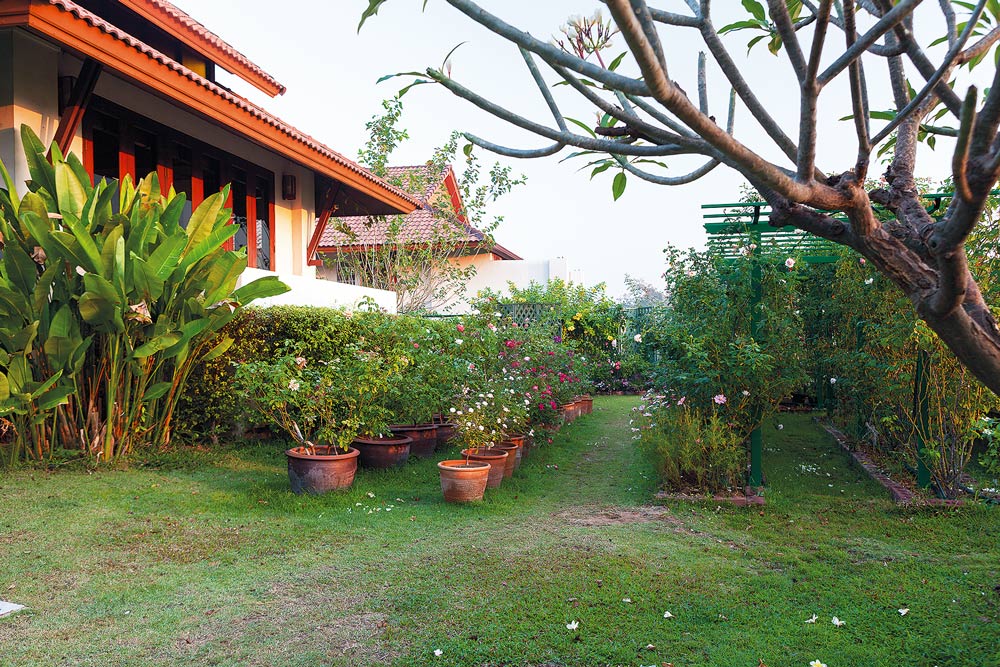 “เริ่มแรกซื้อกุหลาบจากสวนรักมิตร (ที่ตลาดไทและจังหวัดนครราชสีมา) เพราะเพื่อนแนะนำ หลังๆก็ซื้อจากสวนจิระโรส , รังสิตคลอง 14 บ้างก็สั่งจากเฟสบุ๊ก (ห้องกุหลาบ) หรือบางทีแม่บ้านกลับต่างจังหวัด ก็ซื้อกุหลาบถุง ถุงละ 8 บาท จากจังหวัดเลยกลับมาฝากบ้าง แรกๆก็เลี้ยงในกระถาง จัดวางเรียงๆไว้บริเวณนี้ (ปัจจุบันเป็นสวน) แม่บ้านคอยรดน้ำ ตอนหลังเยอะขึ้นก็เลยทำระบบสปริงเกลอร์ รวมถึงมีระบบพ่นหมอกไว้ใช้ในวันที่อากาศร้อนจัดด้วย”