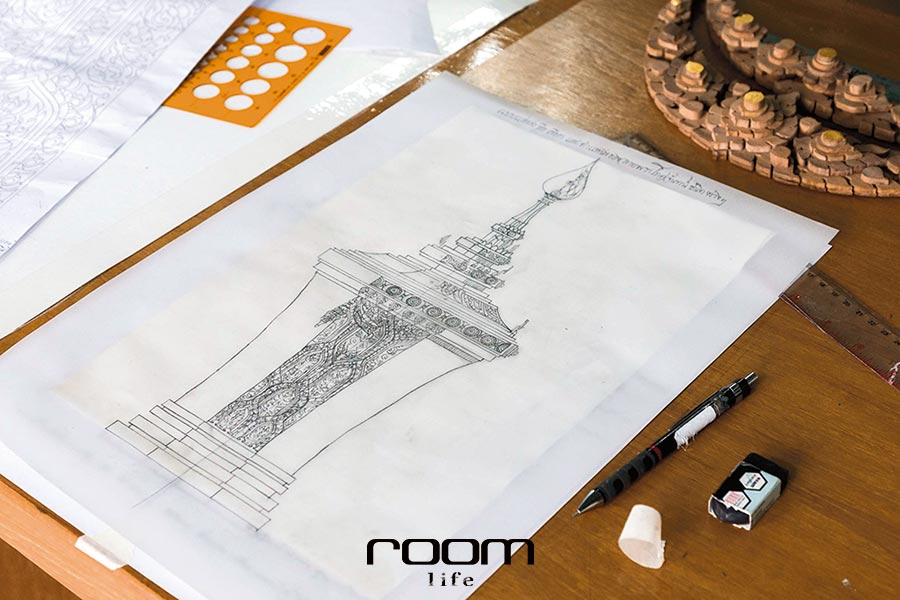 ขั้นตอนการจัดสร้างเริ่มจากการนำแบบขยายมาปรับให้เหมาะกับการจัดสร้างจริงโดยเลือกลวดลายให้เหมาะกับสีสันที่มีโทนสีเข้ม –อ่อนไม่เท่ากัน รวมถึงความหนาของไม้ที่มีตั้งแต่ 2-8 มิลลิเมตร จากนั้นจึงค่อยแปะกระดาษแบบลงบนแผ่นไม้ ใช้เลื่อยฉลุทีละชิ้นก่อนนำชิ้นไม้เหล่านั้นมาติดซ้อนกันด้วยกาวลาเท็กซ์เพื่อให้ได้ลวดลายนูนต่ำตามแบบแล้วนำลวดลายซ้อนไม้แต่ละชุดมาผูกติดด้วยเส้นลวดเข้ากับโครงสร้างเหล็กขึงตาข่าย และปิดทองคำเปลวตามแบบ โดยใช้ช่างฝีมือ 10 คน จิตอาสา 80 คน