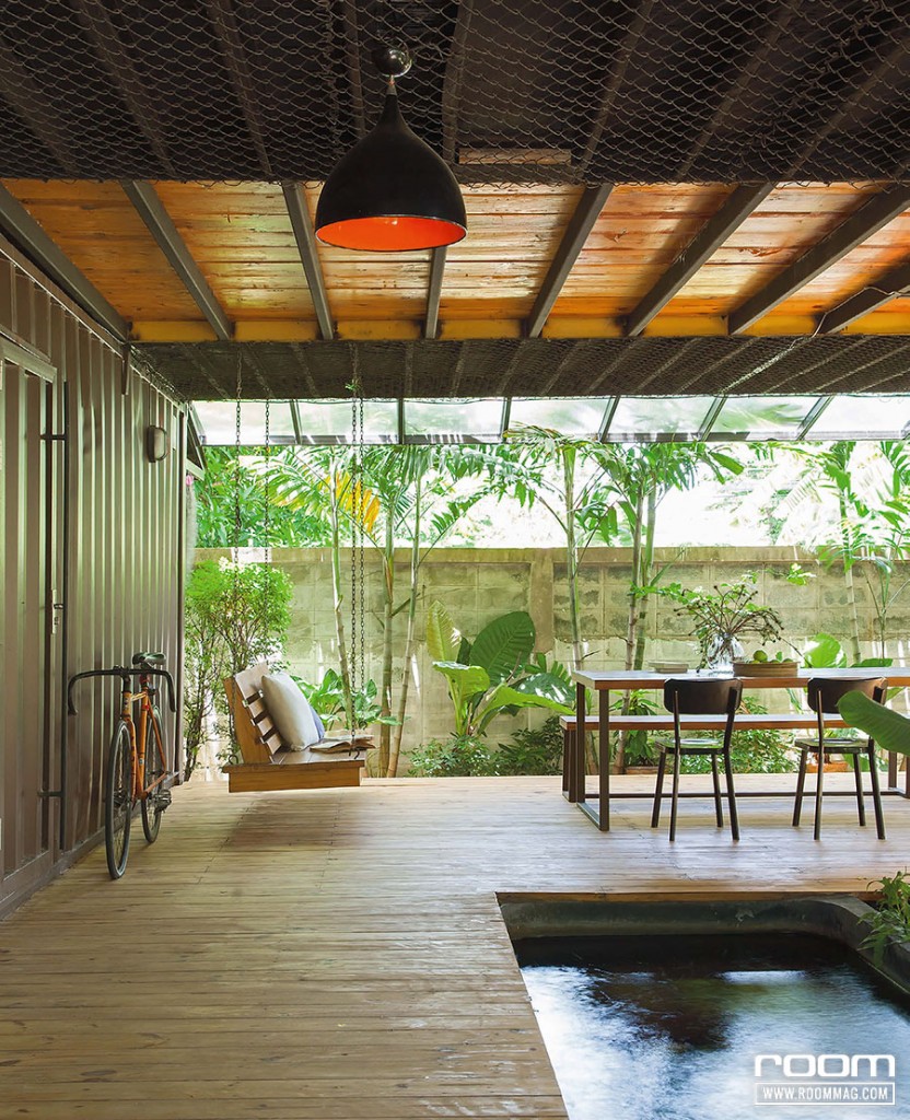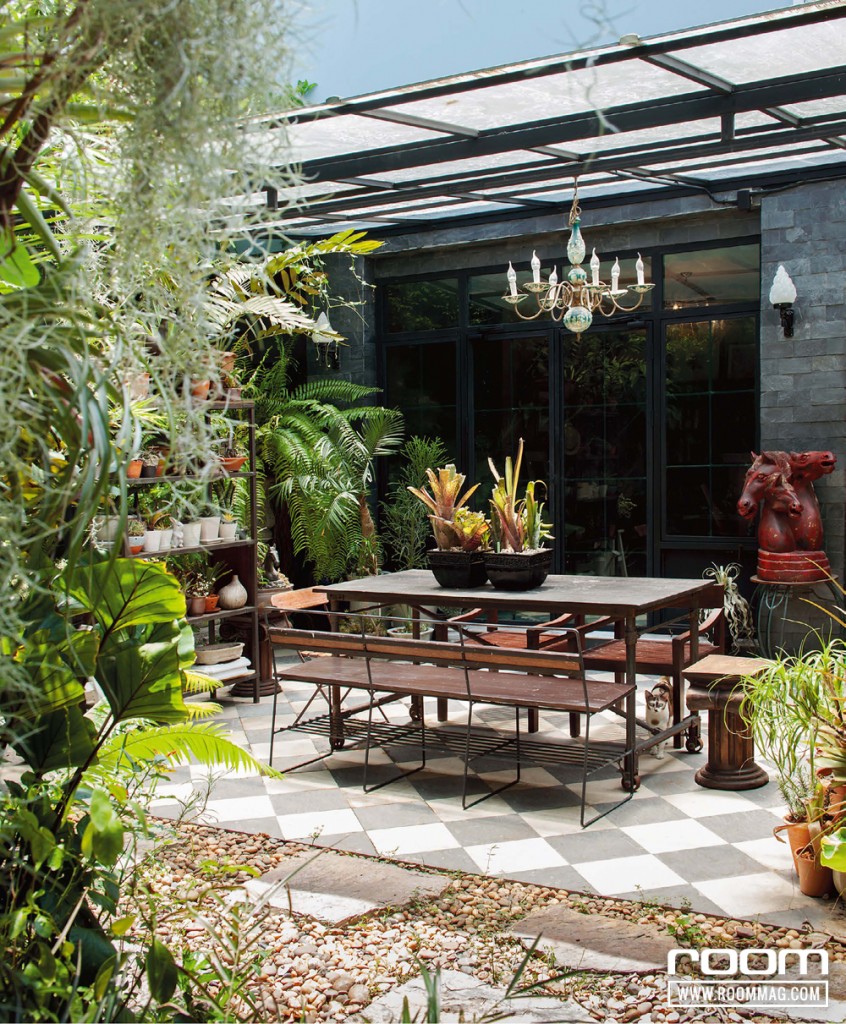 04 สำหรับคนรักสวนหรือมีพื้นที่สวนในบ้าน การจัดมุมนั่งเล่นท่ามกลางแมกไม้จะทำให้คุณสดชื่นทุกครั้งที่มานั่ง โดยเฉพาะสวนหน้าบ้านที่นอกจากจะเป็นมุมนั่งเล่นแล้ว ยังทำหน้าที่รับแขกได้อีกด้วย เพียงวางโต๊ะรับแขกชิลๆ พร้อมต้อนรับผู้มาเยือนด้วยผนังกรุหินกาบสีเข้มสร้างบรรยากาศขรึม ตัดกับแมกไม้สีเขียวกลมกลืนไปกับกรอบประตูและโครงหลังคาเหล็กกรุพอลิคาร์บอเนตสำหรับกรองแสง