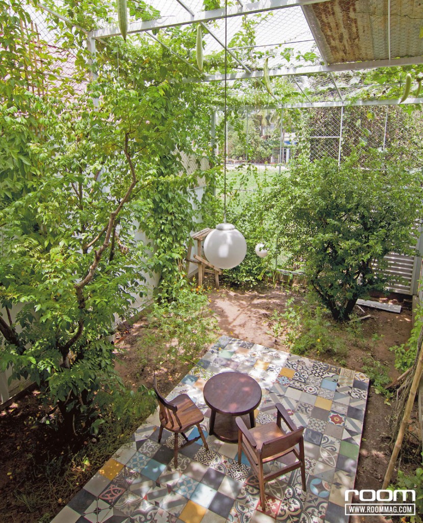 03 พื้นที่นั่งพักผ่อนแบบกึ่งเอ๊าต์ดอร์ดูเป็นส่วนตัวในพื้นที่หลังบ้านที่โอบล้อมด้วยสวนหย่อม โดยแบ่งส่วนหลังคาให้มีทั้งแบบเปิดโล่งมองเห็นท้องฟ้าและอีกส่วนกรุหลังคาทึบ ส่วนพื้นชั้นล่างก็กรุกระเบื้องหลากลวดลาย ดูแลทำความสะอาดง่าย