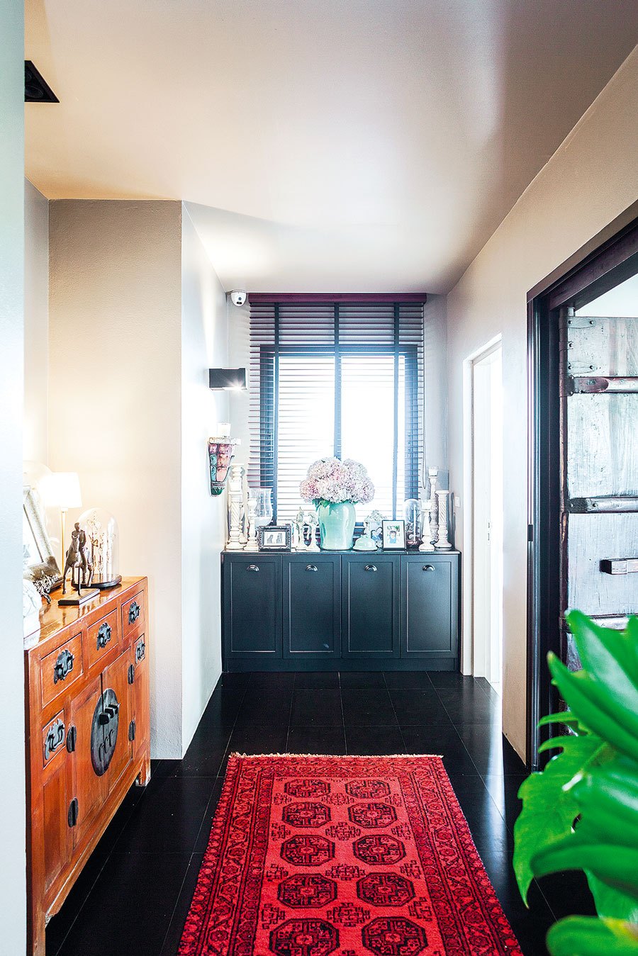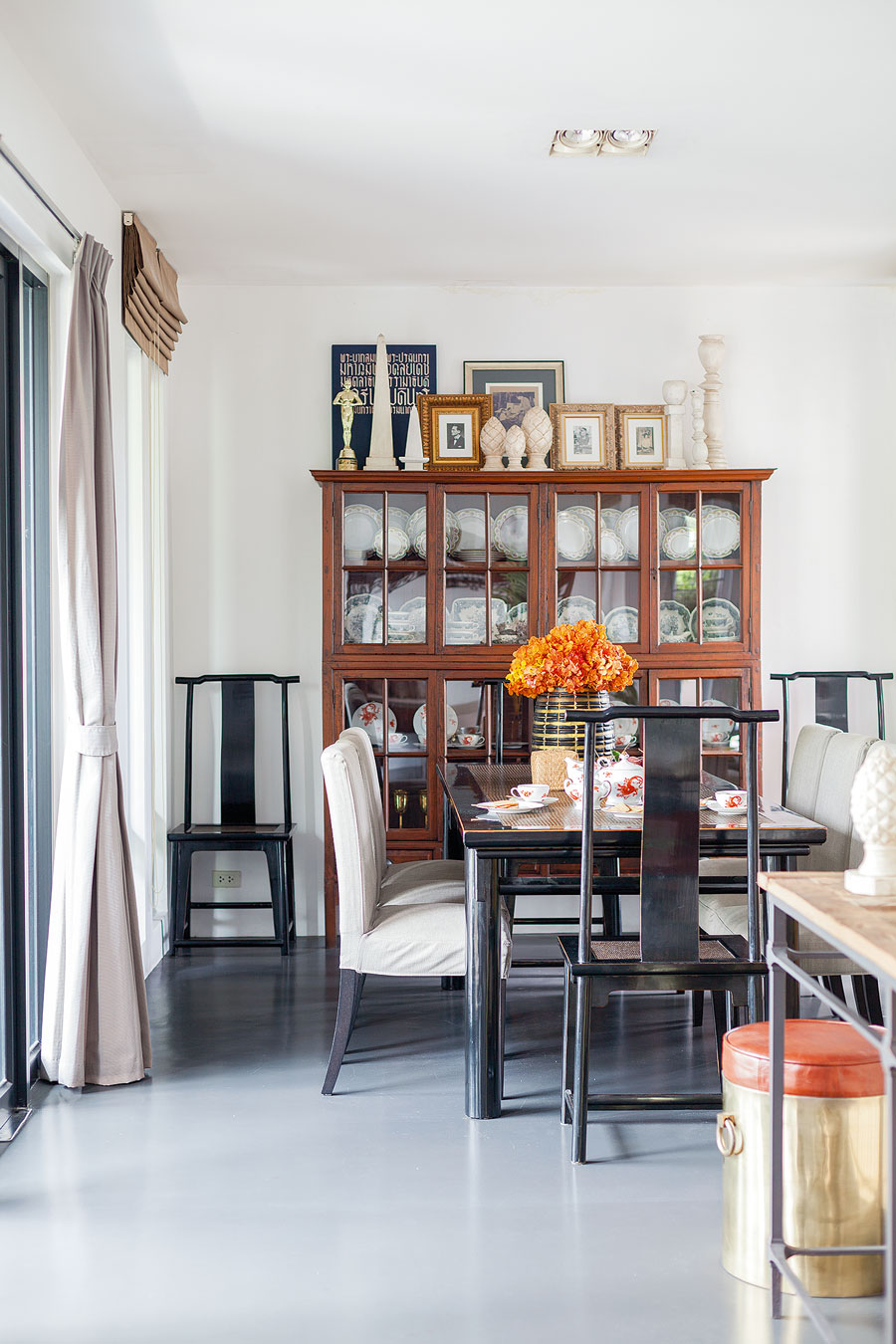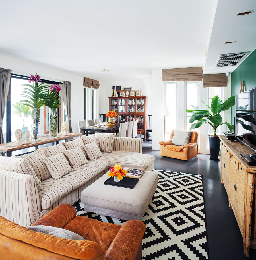 ดังนั้นของตกแต่งในบ้านนี้จึงผสมผสานกันระหว่างเฟอร์นิเจอร์สไตล์จีน วินเทจ โมเดิร์น และคลาสสิกในแบบที่กลมกล่อมลงตัว คุณอาร์ตเสริมกับเราอีกว่า “จริงๆผมไม่ได้ซีเรียสว่าต้องเป็นสไตล์โอเรียนทัลหรือจีนนะ ผมเองก็ไม่เคยมีบ้านสไตล์นี้ และคงเป็นความบังเอิญด้วยว่ามีตู้วางทีวีสไตล์จีนที่มาจากบ้านเก่า มีเก้าอี้และโต๊ะรับประทานอาหารที่เจ้าของบ้านเดิมทิ้งไว้ให้ บวกกับได้ตั่งโบราณมาอีก ก็เลยได้อารมณ์โมเดิร์นไชนีส ซึ่งผมก็ชอบนะ”