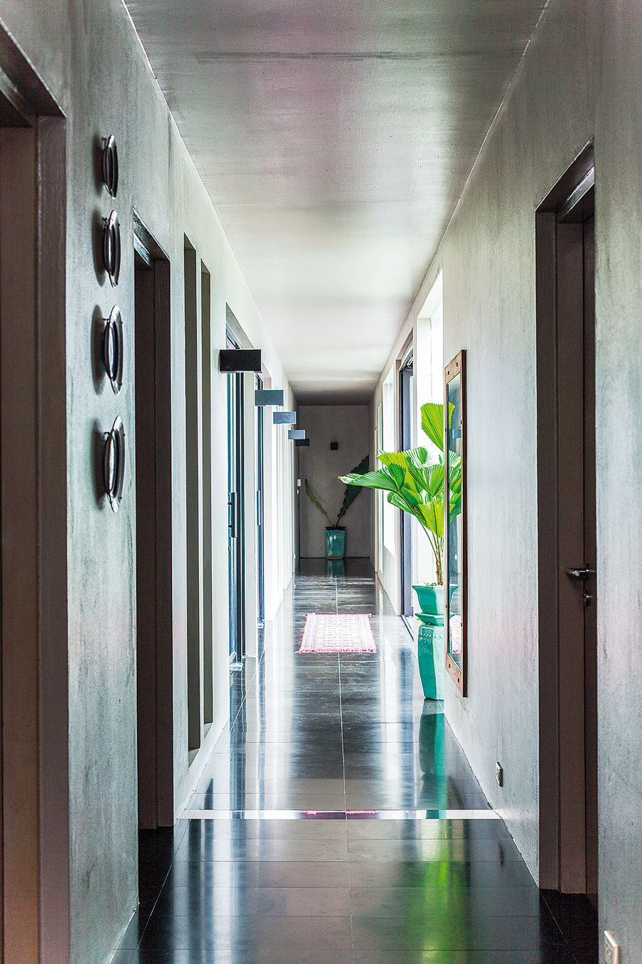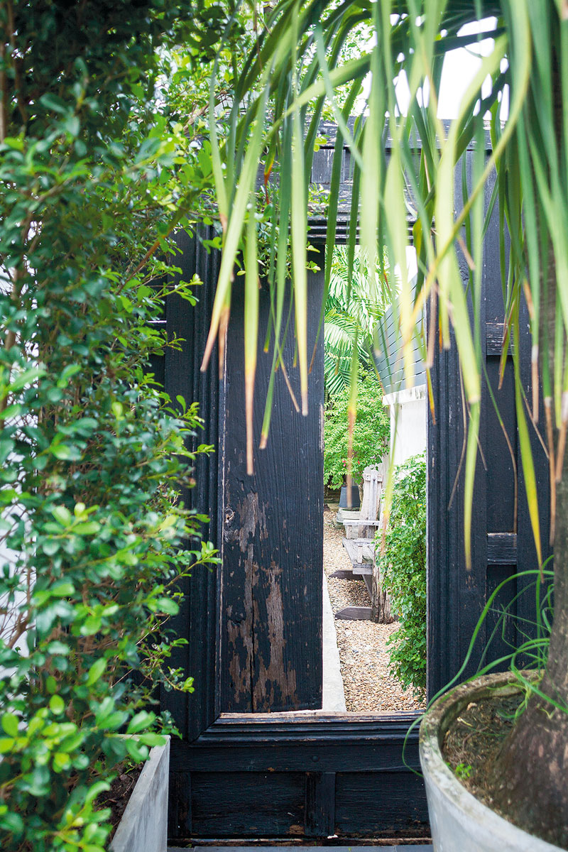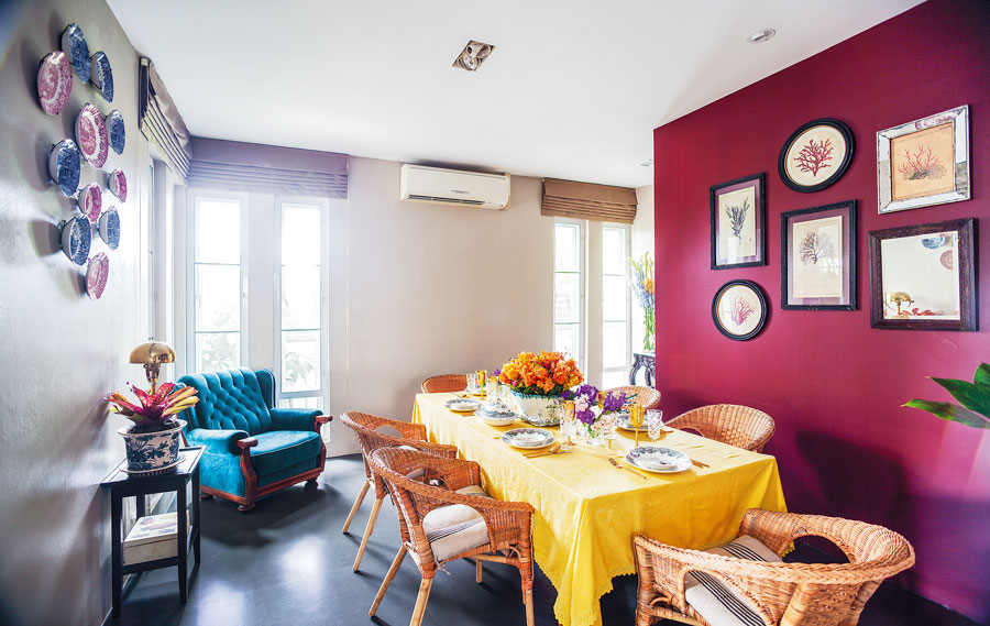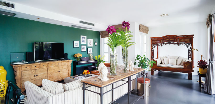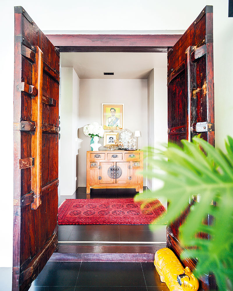 “คุณอาร์ตชอบสีเขียวหัวเป็ดและสีน้ำเงิน บางผนังในบ้านจึงเลือกทาสีนี้ ซึ่งช่วยสร้างความน่าสนใจได้เป็นอย่างดี ส่วนสไตล์ของเฟอร์นิเจอร์จริงๆเริ่มมาจากโต๊ะกินข้าวตัวแรกที่เป็นสไตลโอเรียนทัลแนวจีนๆหน่อย ซึ่งเจ้าของบ้านเดิมทิ้งไว้ให้ ก็ช่วยเบรกความแข็งของบ้านสไตล์โมเดิร์นได้ จากนั้นก็เลือกของวินเทจนิดๆจากบ้านเก่าของคุณอาร์ตมาเสริมบ้าง เลือกแบบที่ดูไม่เป็นสไตล์จีนมากจนเกินไป อย่างโอ่งของเถ้าฮงไถ่ก็เลือกแบบเรียบๆ ไม่ใช่แนวโบราณ”