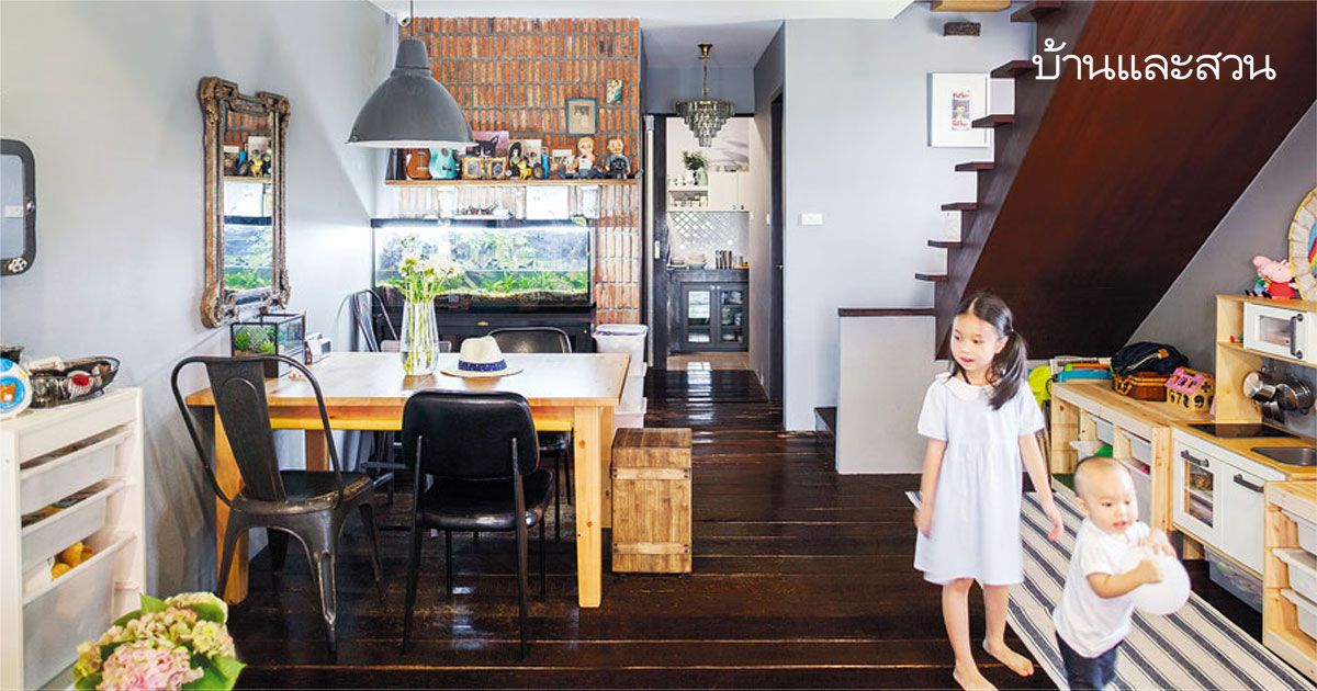 “บ้านนี้เป็นทาวน์เฮ้าส์เก่าที่อยู่มาสิบปีแล้ว ซื้อมาตอนแรกก็ปรับปรุงเลย จากนั้นก็มีการปรับเปลี่ยนมาตลอด พอมีลูกยิ่งปรับชัดเจน เพราะเด็กต้องเติบโตขึ้นเรื่อยๆ อย่างบ้านเรามีเด็กสองคนก็ต้องแบ่งพื้นที่ให้ดี คอยสังเกตการใช้งานของพวกเขา เช่น คนโตต้องทำการบ้าน แต่คนเล็กก็อยากมาเล่นด้วย”