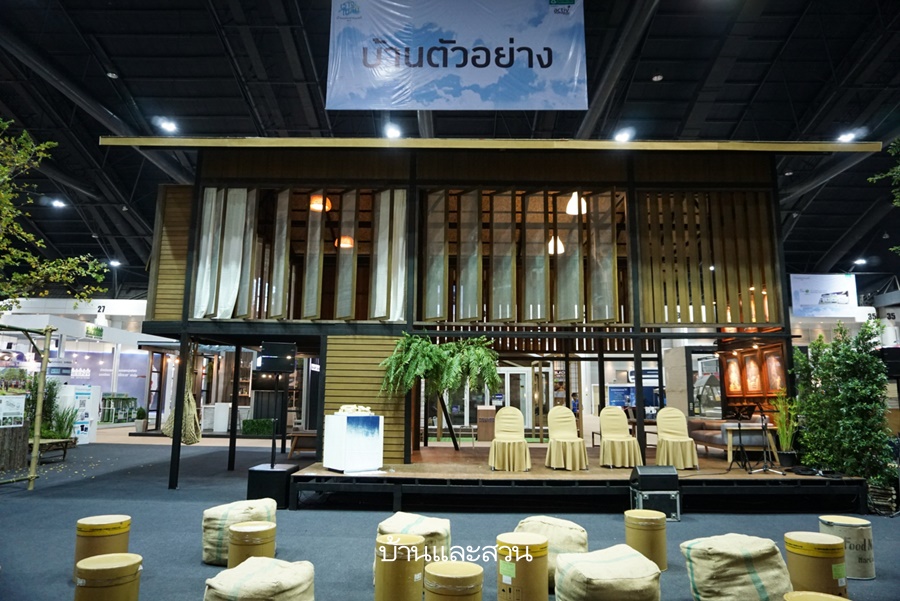 เริ่มกันที่โซนแรกที่เรียกได้ว่าเป็นพระเอกของงานเลยนั้นก็คือ “บ้านตัวอย่าง” ซึ่งในครั้งนี้มาในรูปแบบบ้านไม้ไทยๆ จำลองบรรยากาศบ้านเรือนที่ปลูกอยู่ในพื้นที่เดียวกัน มีทั้งแปลงพืชผักสวนครัวและเล้าไก่ตามแนวความคิด “หารร่วมมาก” ใช้ชีวิตอยู่กับธรรมชาติบนความพอเพียง