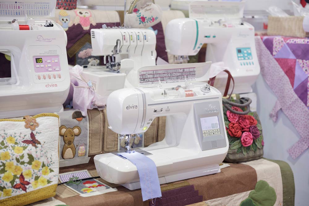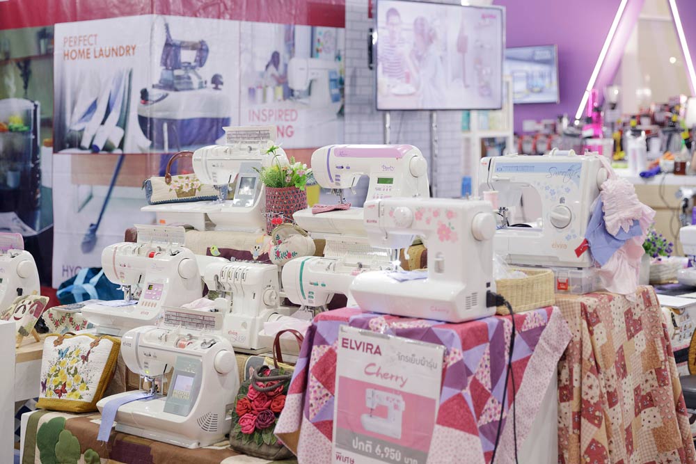 แต่หากใครไม่ชอบนั่งประดิษฐ์ลวดลายและอยากได้ความรวดเร็วในงานปัก ต้องแวะที่บูธ Elvira ที่ยกจักรเย็บผ้าไฟฟ้ามาให้เลือกหลายสิบชิ้น แต่ละชิ้นก็มีราคาที่ต่างตามฟังก์ชั่น อย่างรุ่นใหม่ๆ สามารถปักลายได้หลายแบบเลยค่ะ