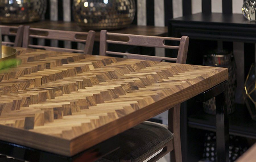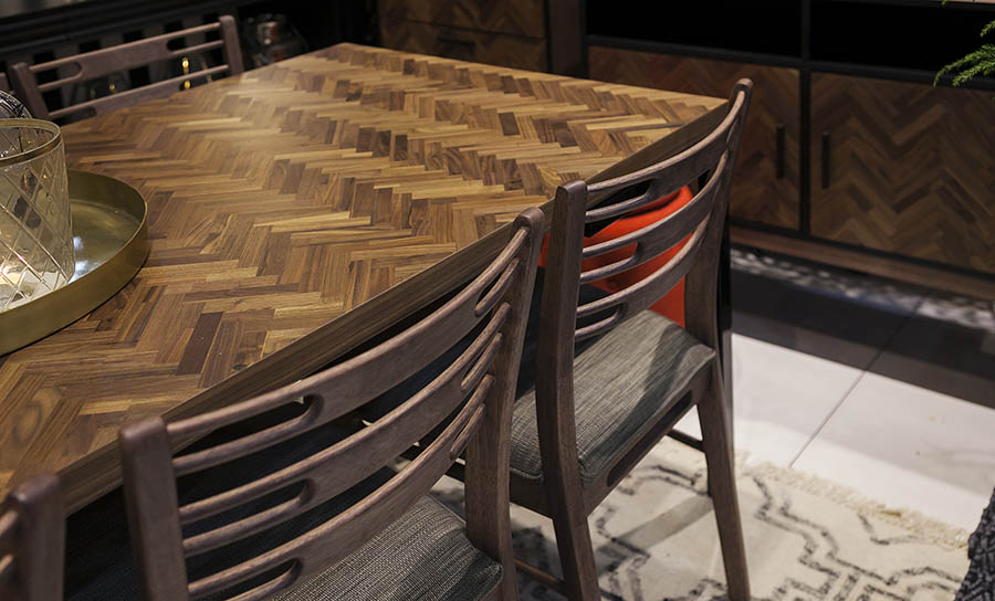 โต๊ะกินข้าวสไตล์ลอฟต์ ท็อปด้วยไม้อเมริกันวอลนัท เรียงเป็นลวดลาย pattern ก้างปลาสวยงาม กับฐานและขาเหล็กสีดำ ตกแต่งมุมรับประทานอาหารให้น่าสนใจและดูมิติมากขึ้นได้